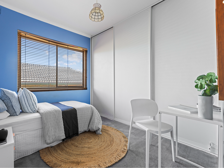 The spacious layout includes three bedrooms, each featuring built-in robes and modern amenities such as reverse cycle air conditioning and wall-mounted TVs. The master bedroom offers a peaceful retreat with its position at the front of the house, while the third bedroom overlooks the inviting pool area.