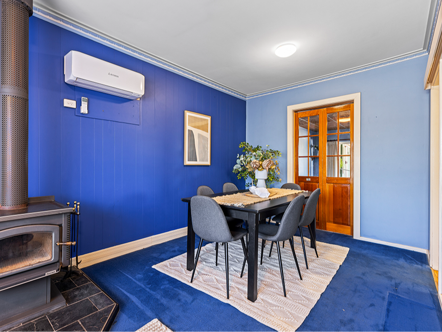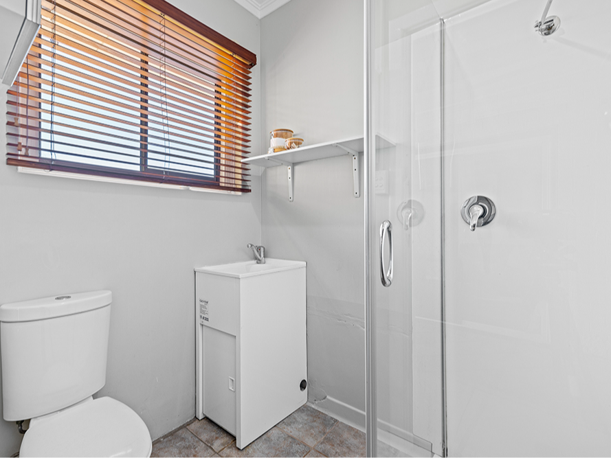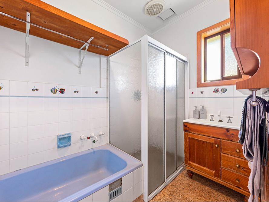 The heart of the home features a cozy lounge area with a large combustion wood fireplace, complemented by reverse cycle air conditioning for year-round comfort. The kitchen, though basic, provides functionality with an electric stove, while the bathroom offers both a separate shower and bathtub, accompanied by a convenient second toilet and shower in the modified laundry area.