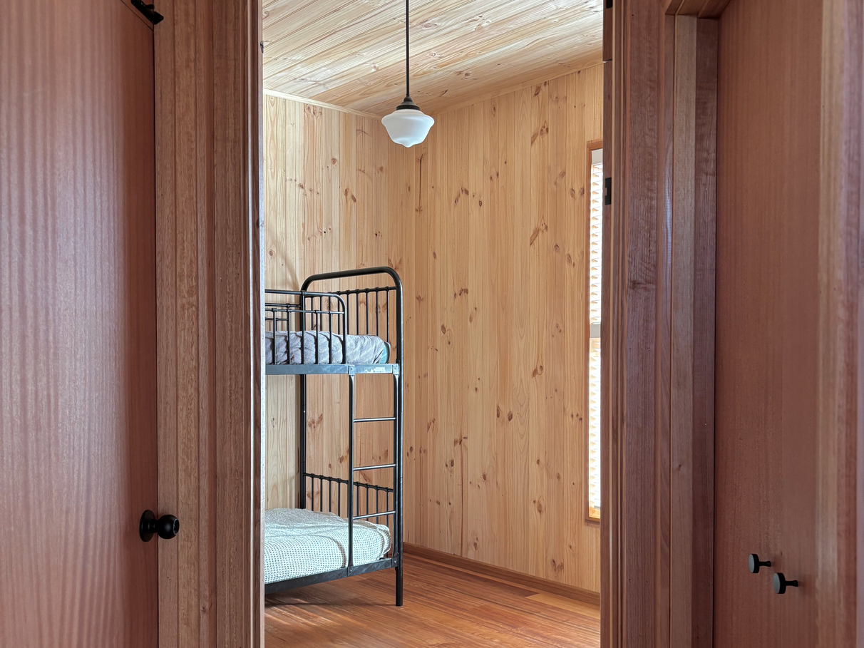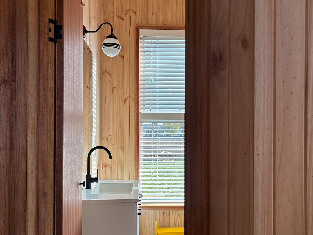 Locally quarried sandstone step between a pair of established pencil pines leads onto a small hardwood deck. A symmetrical facade according to the Georgian village character is stained charred grey, evoking traditional Tasmanian tarred timber buildings. An Egyptian red six-panel hardwood door with solid brass hardware opens into a small entrance hall.