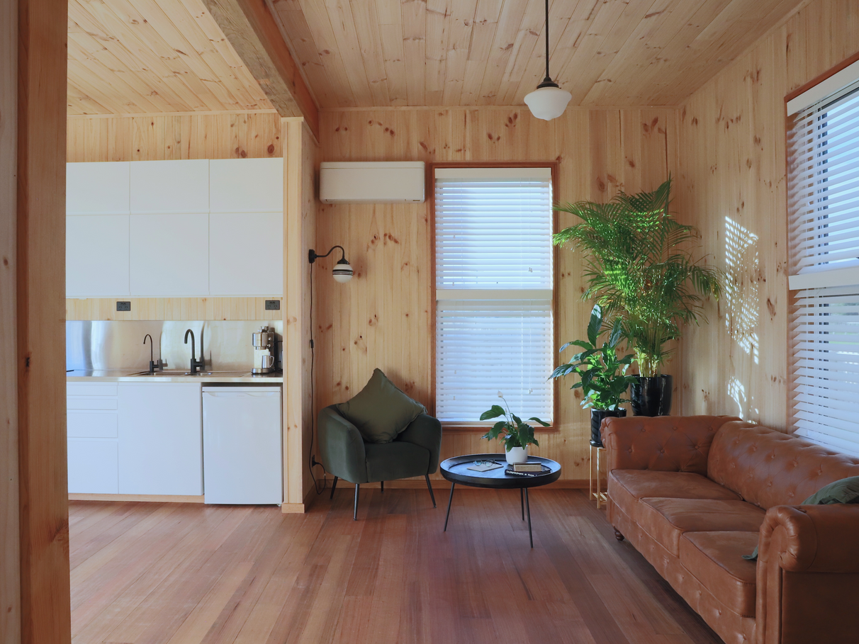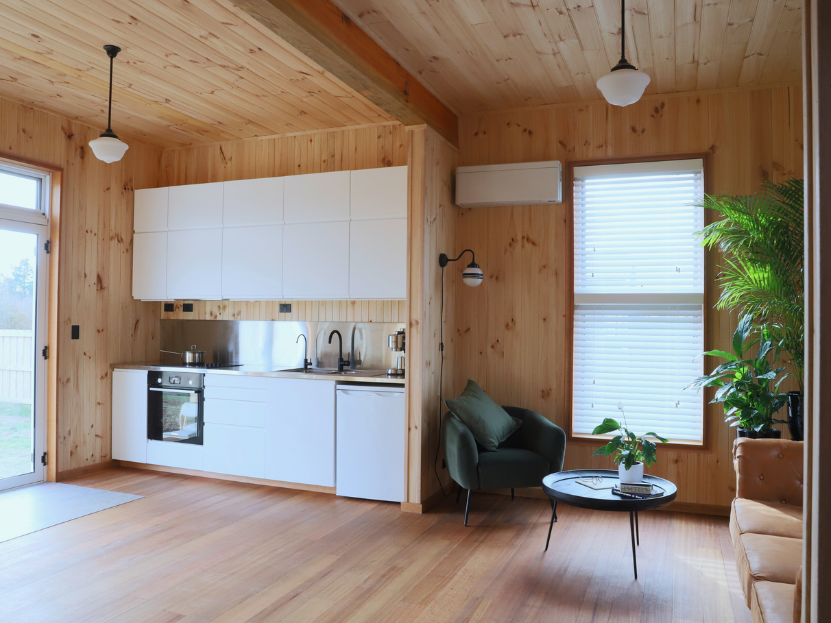 Premium Daikin Zena A/C unit can be controlled remotely via mobile and warms the home in minutes even on the coldest nights. Wood heater can be easily installed if desired. Floor-to-ceiling convection doors allow for effective passive ventilation and heat transfer to bedrooms, eliminating the need for fans or ducting. Ceiling, walls and floor are throroughly insulated.