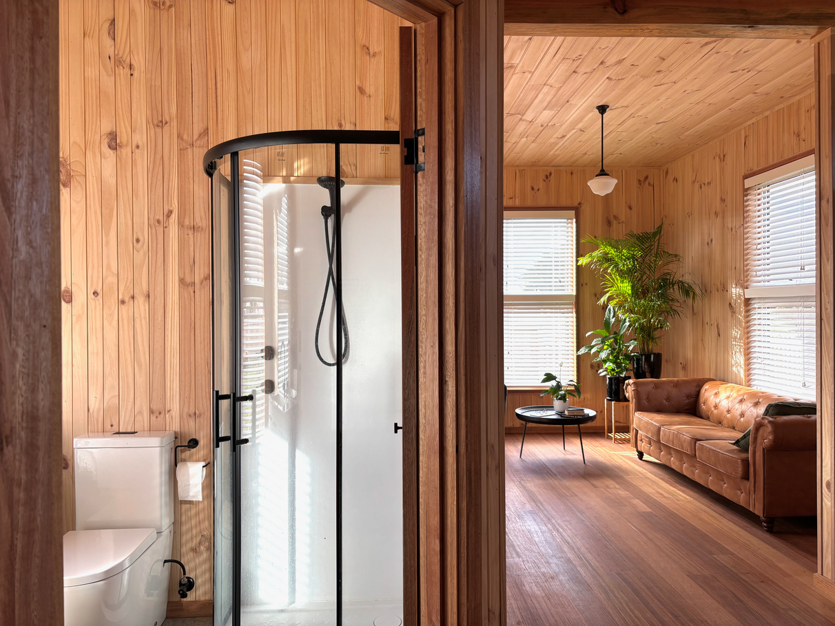 The interior immediately impresses with lofty 3 metre ceilings supported by massive cedar beams, natural pine lining and warm Tasmanian oak floorboards, as well as abundance of light entering through generously sized double glazed windows and timber venetian blinds.