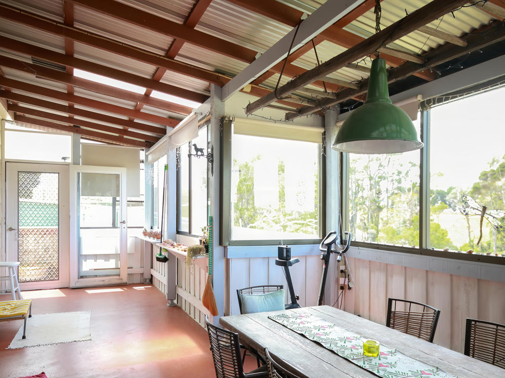 A large, east facing, enclosed sunroom (rumpus room) is a perfect place to enjoy the sunrise and the view of neighbouring woodland. Such a beautiful space to have breakfast, lunch and dinner in the warmer months.