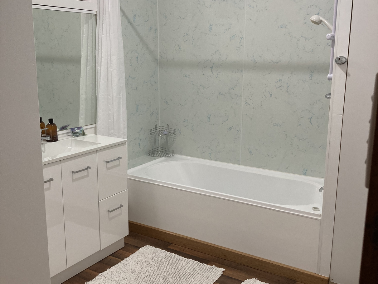 The kitchen/dining room has ample cupboard space and a dishwasher is in place and there is a spot for a fridge and a chest freezer (if you require).