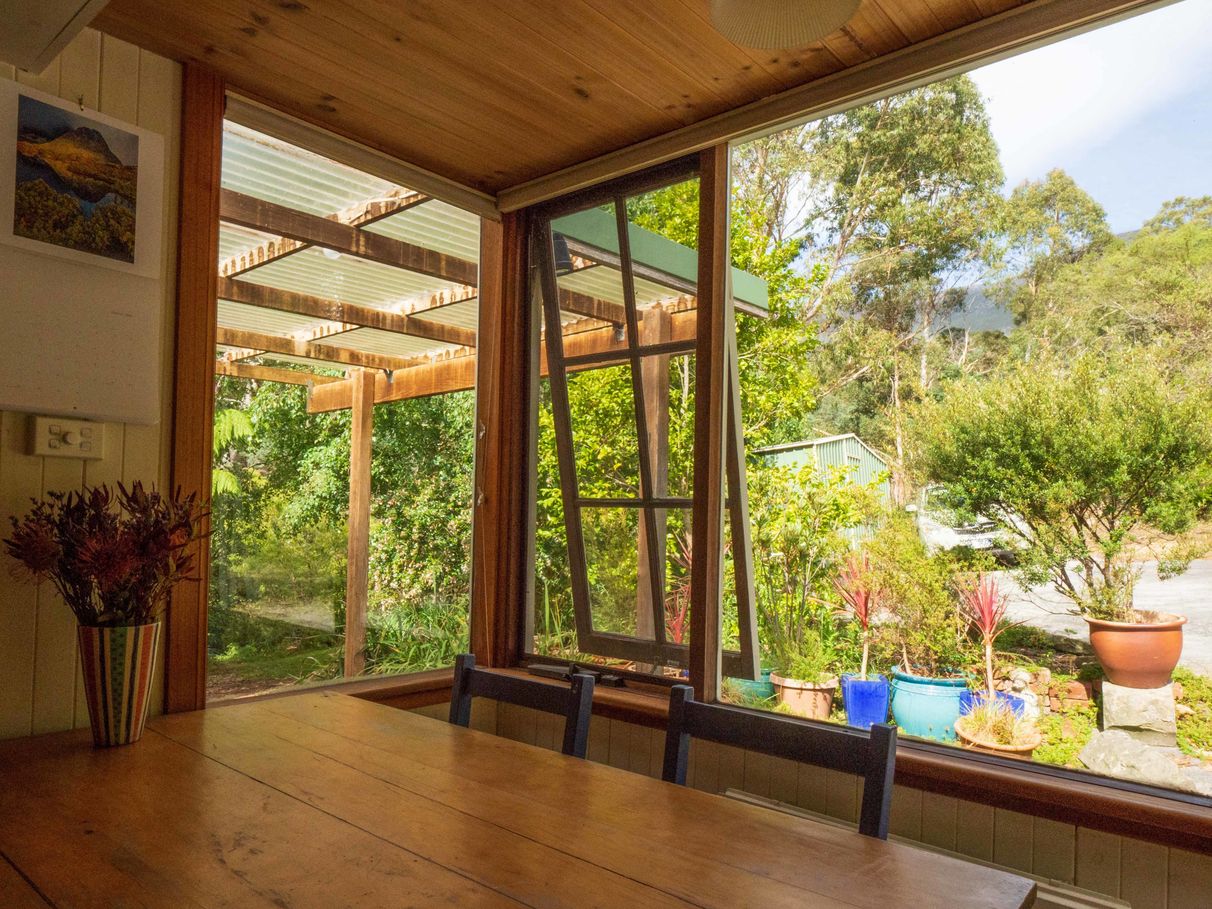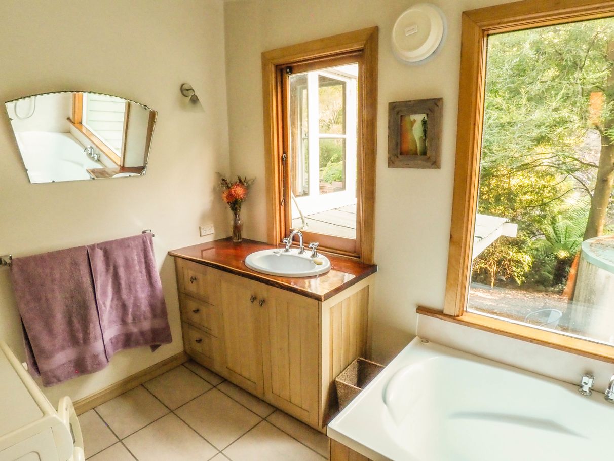 • french doors to deck overlooking tree ferns, myrtles, leatherwoods and a huon pine