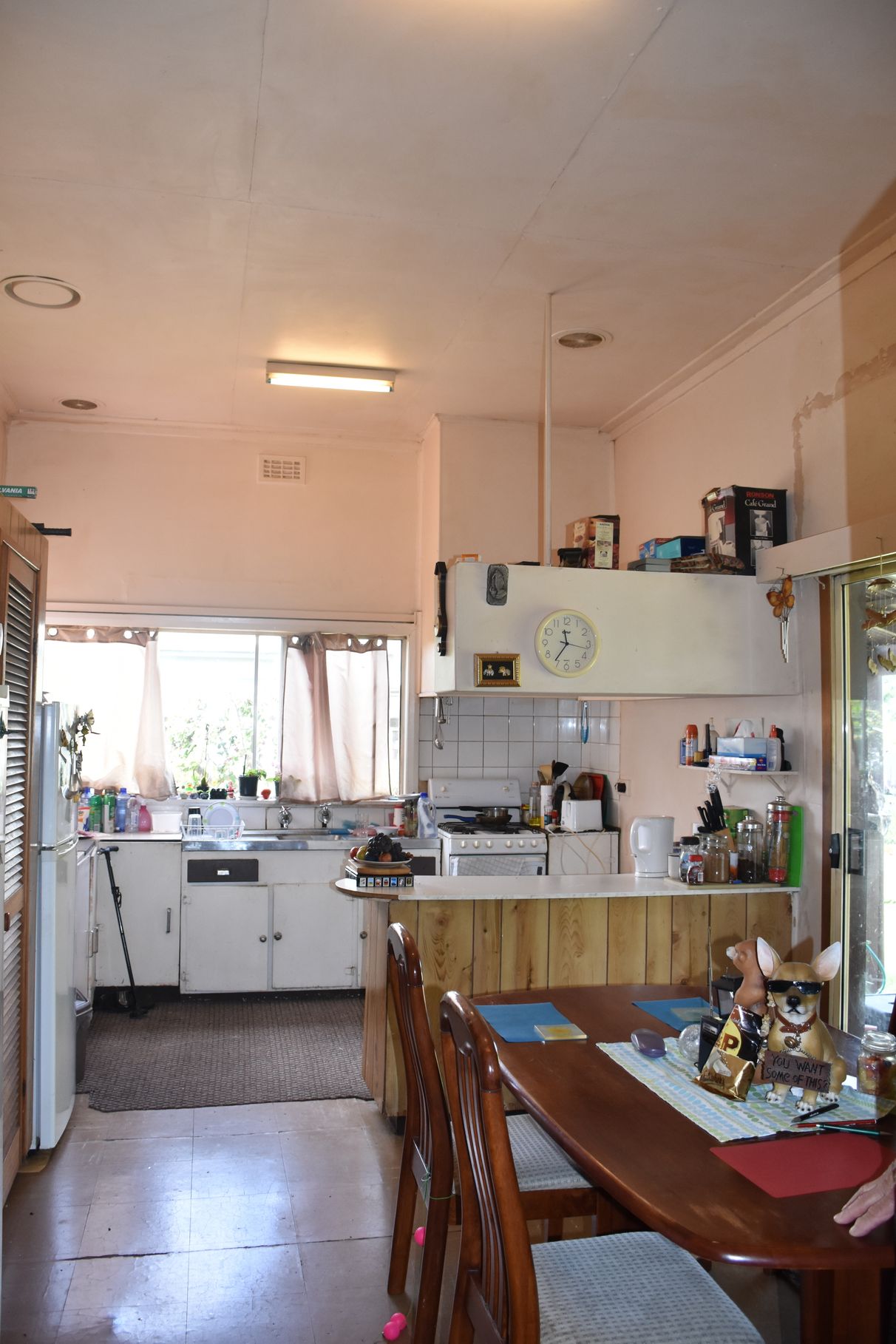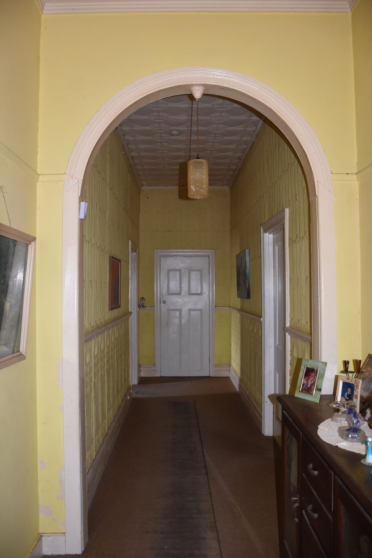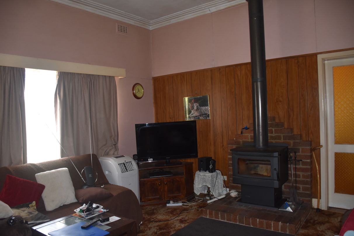 although the inside may require a few updates it offers spacious rooms and unique features such as 11 foot ceilings and pressed tin features in the hallway and ceiling of the master bedroom. you can keep warm in the cooler months in front of the new wood heater.