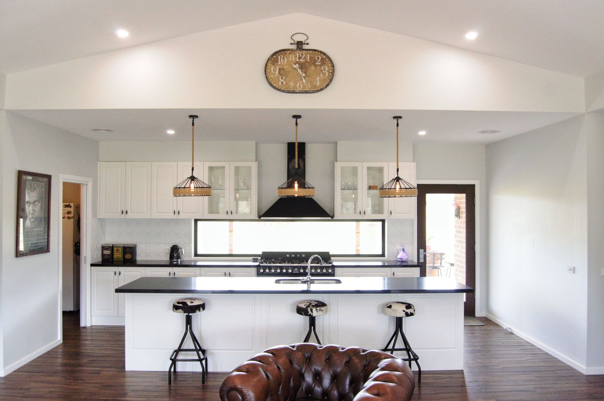 Spacious kitchen equipped with a long island bench, 110cm Smeg stove and range hood, plenty of storage including a walk-in pantry