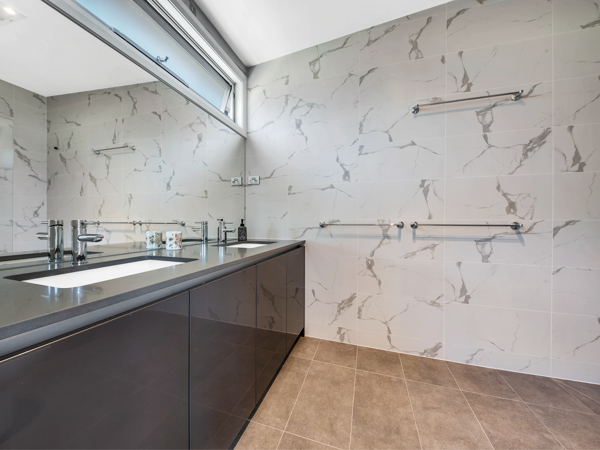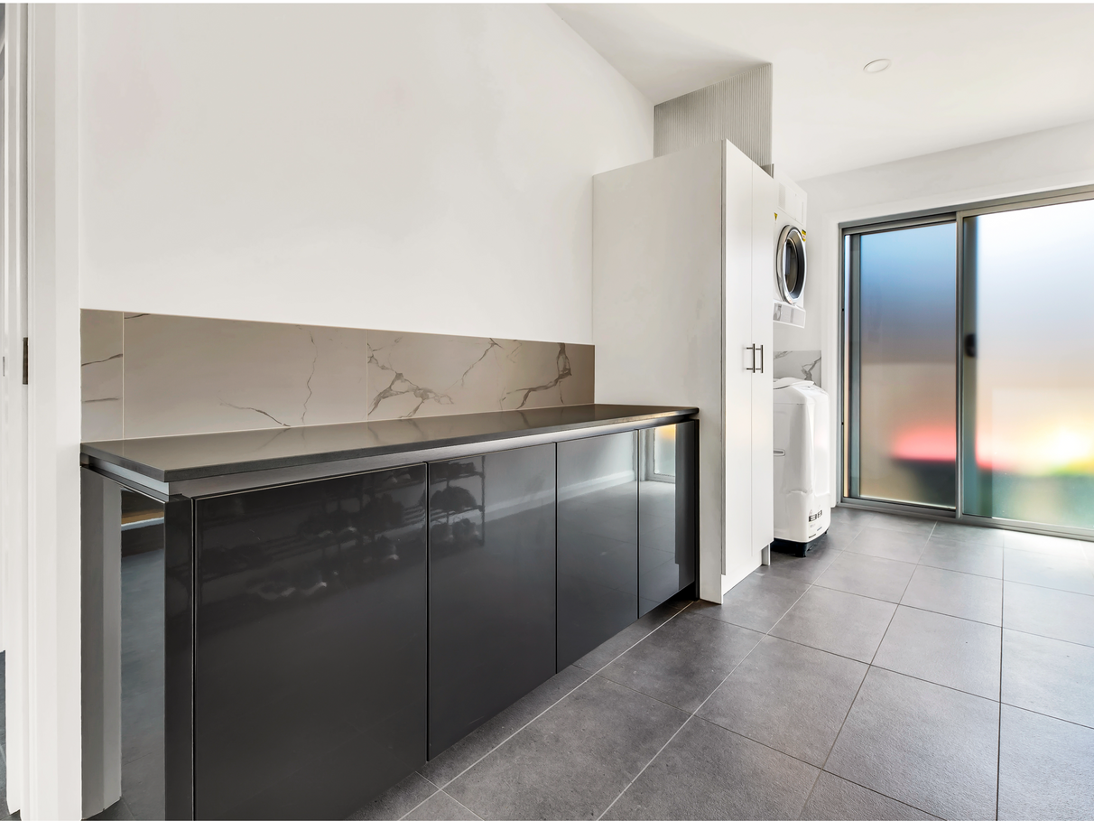 The kitchen features dual-dishwashers, 90cm induction cooktop + large designer sink. Stone bench tops with recessed dual vanities & handless 'Polytec' cabinetry throughout the house.