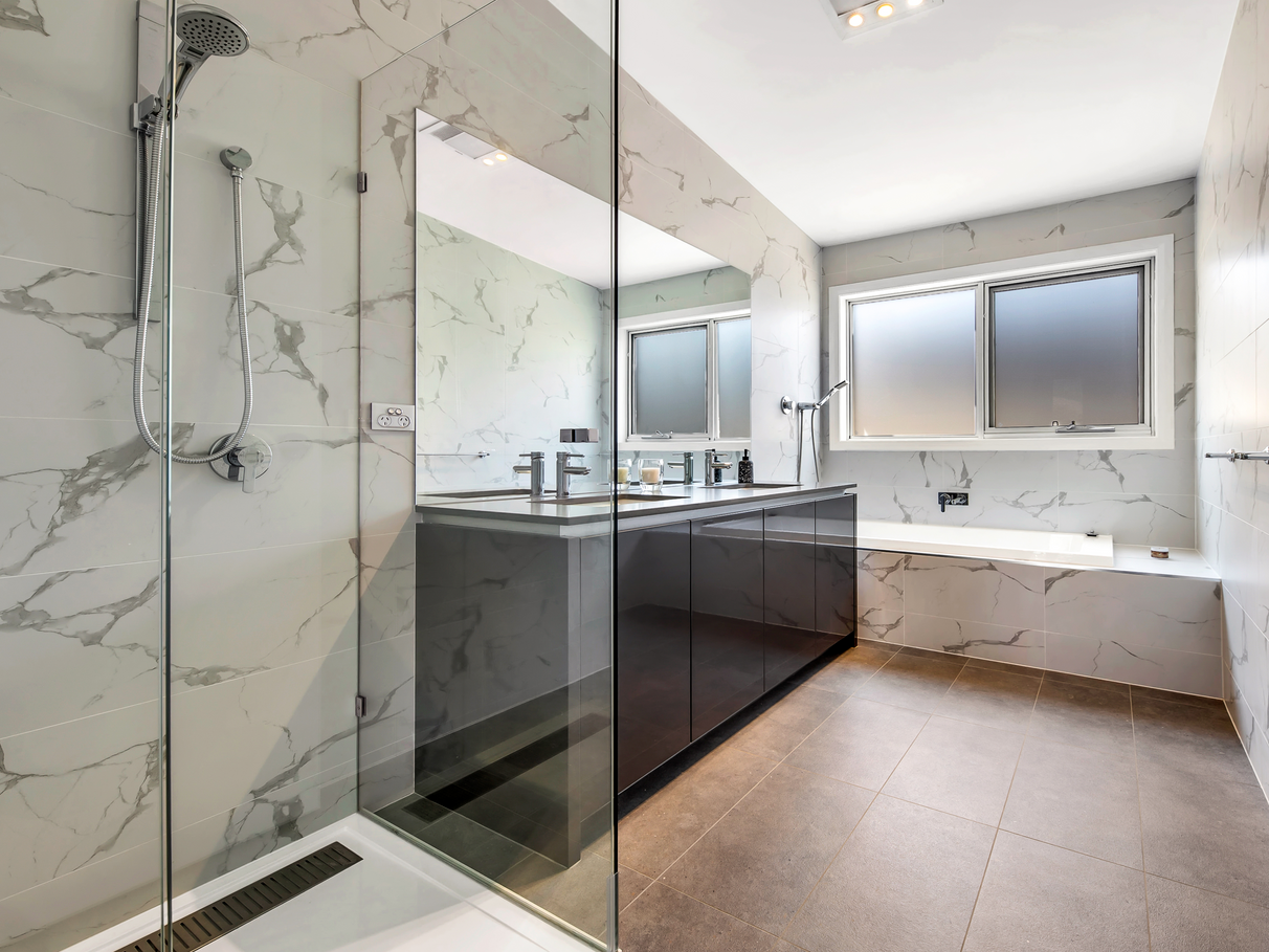 External eaves meet anodised, double glazing, including huge 'commercial spec' façade windows. Impressive spotted gum flooring. Large bathroom mirrors set on floor-to-ceiling porcelain tiles & fully frameless shower screens. Built-in robes with large mirrored sliders. Dimmable LED lighting controlled by illuminated glass switches + multiple A/C units.. No expense has been spared!