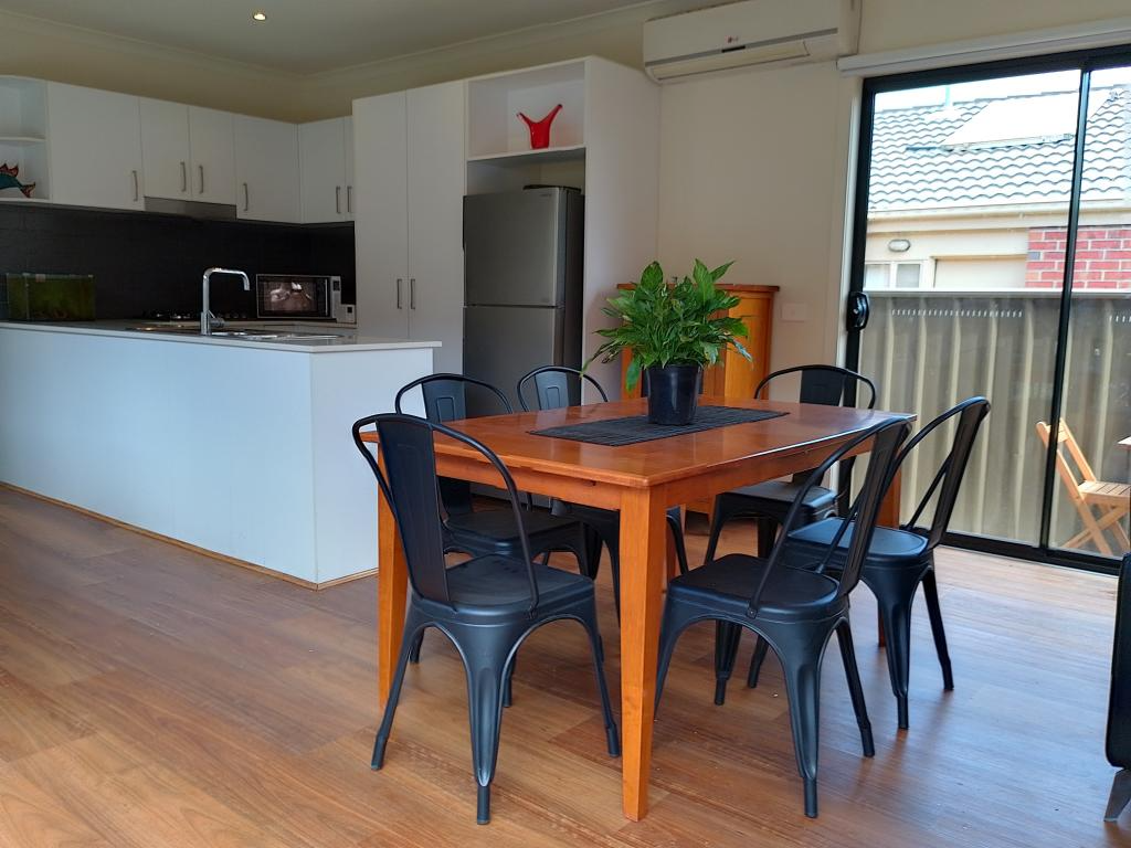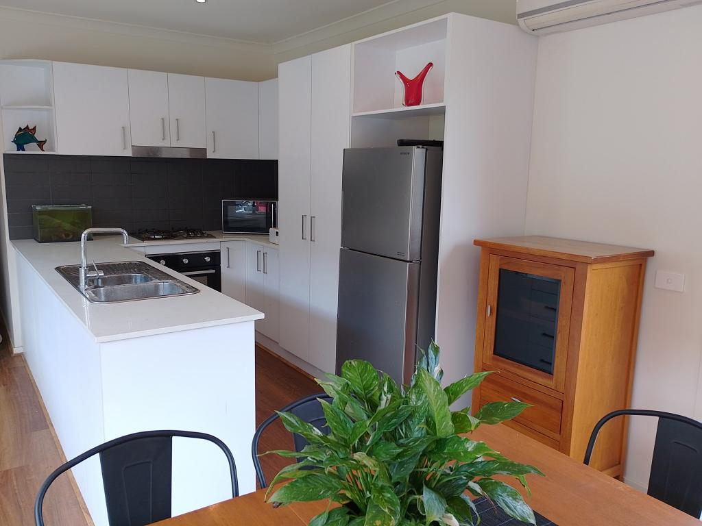 The clean, sleek and modern all-white kitchen which is well-appointed with Caesarstone benchtops and stainless-steel appliances including a gas stove, oven, rangehood and dishwasher and is the focal point of the combined kitchen, dining and living area, which also has a remote control operated reverse-cycle air conditioning cooling and heating system
