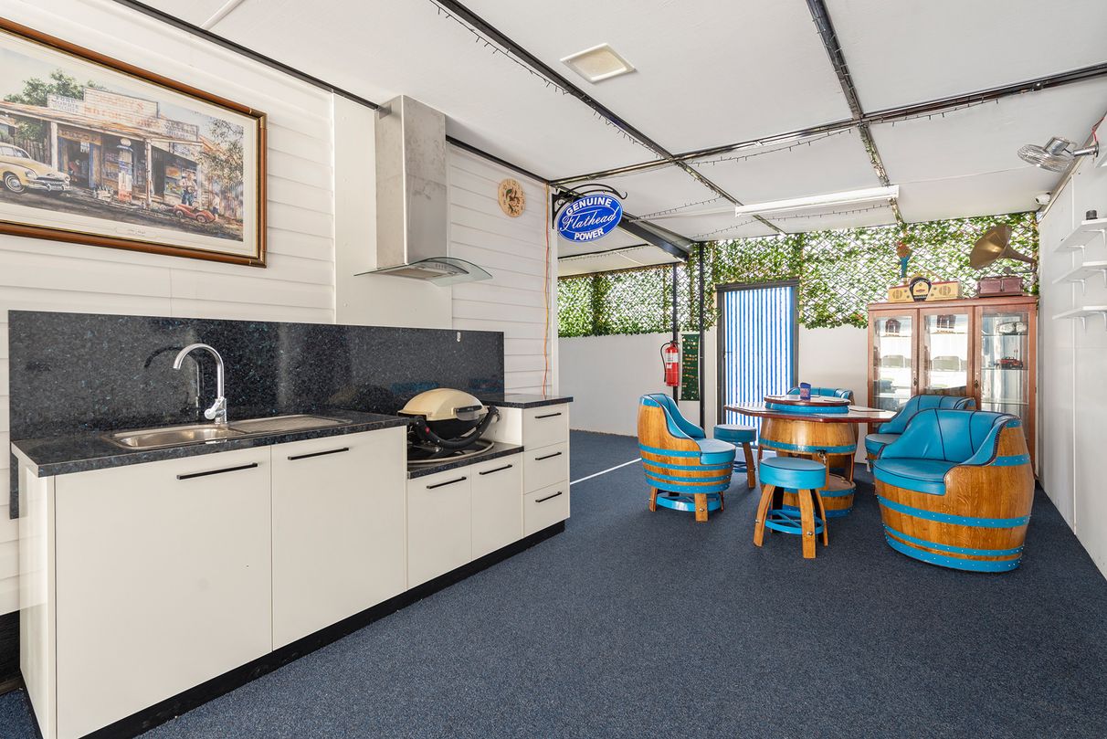 Spectacular outdoor BBQ area with cabinetry and an inbuilt sink, specially built area for the BBQ and exhaust fan above