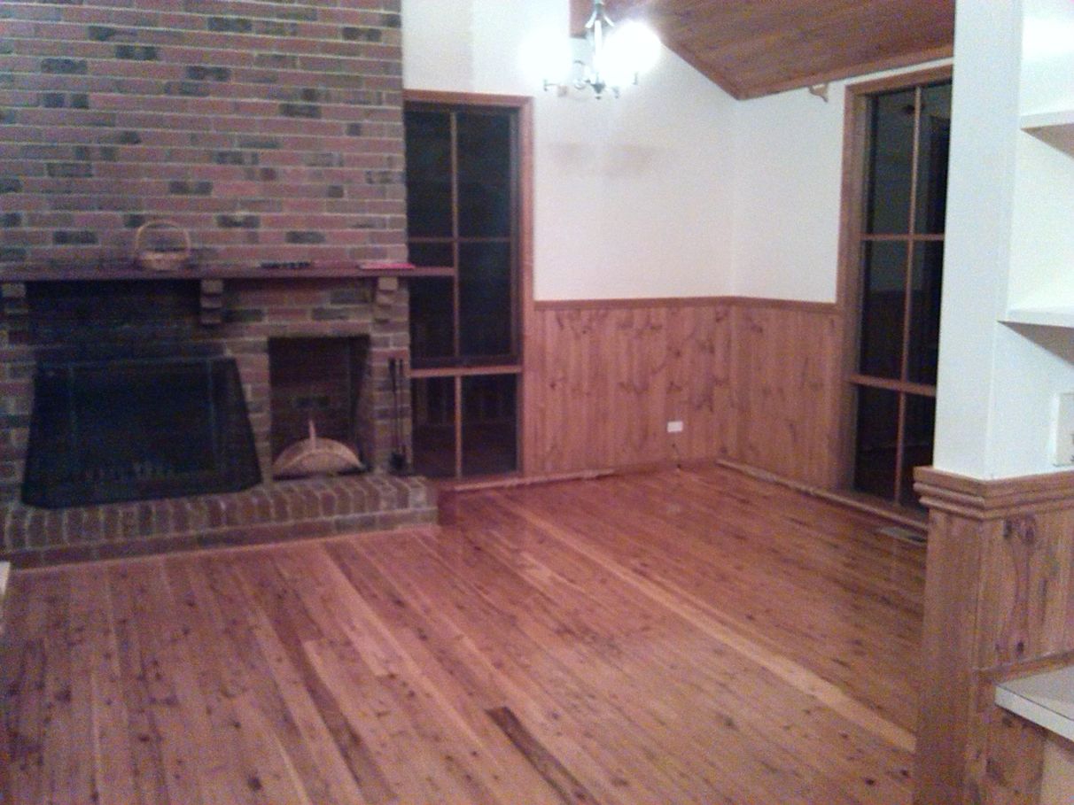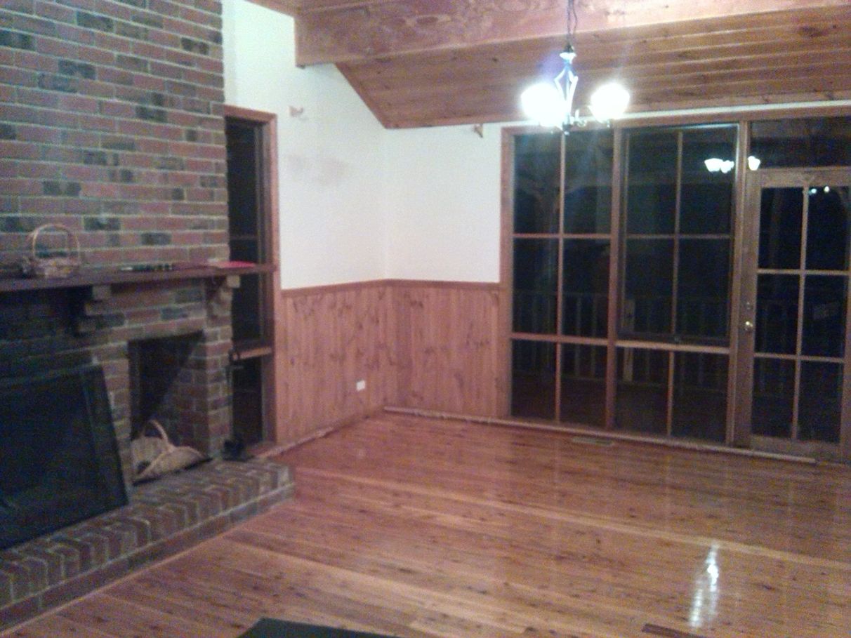 11 feet Cathedral ceilings in an open living area with a great clinker brick open fireplace.