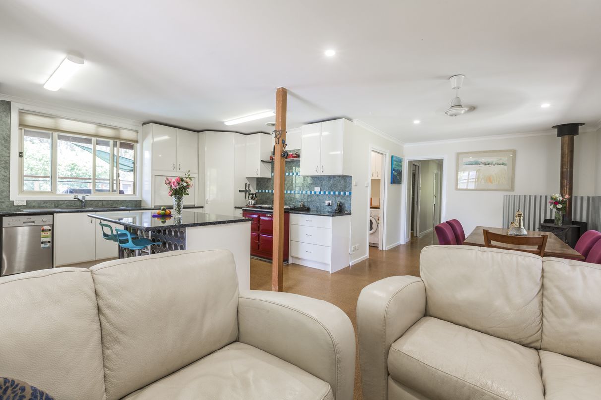 The main house has 2 bedrooms with BIR’s, study and reading area with floor to ceiling bookcase, a large bathroom, with a huge bath, separate toilet, laundry with floor to ceiling cupboards and kitchen, with extensive cupboards, 2 pantries and island bench/family room with split system, Ned Kelly wood heater and imported electric AGA 3 oven stove.