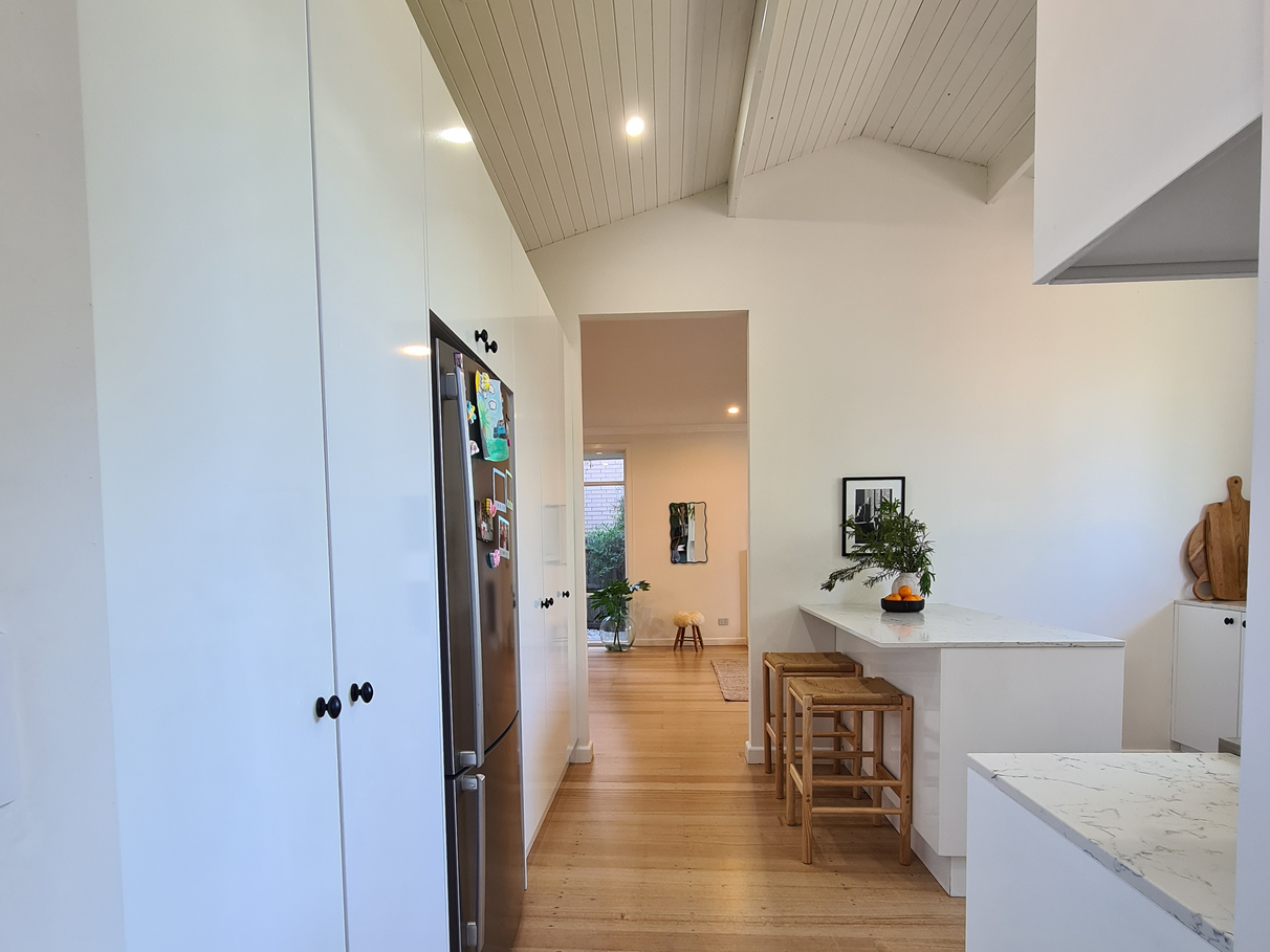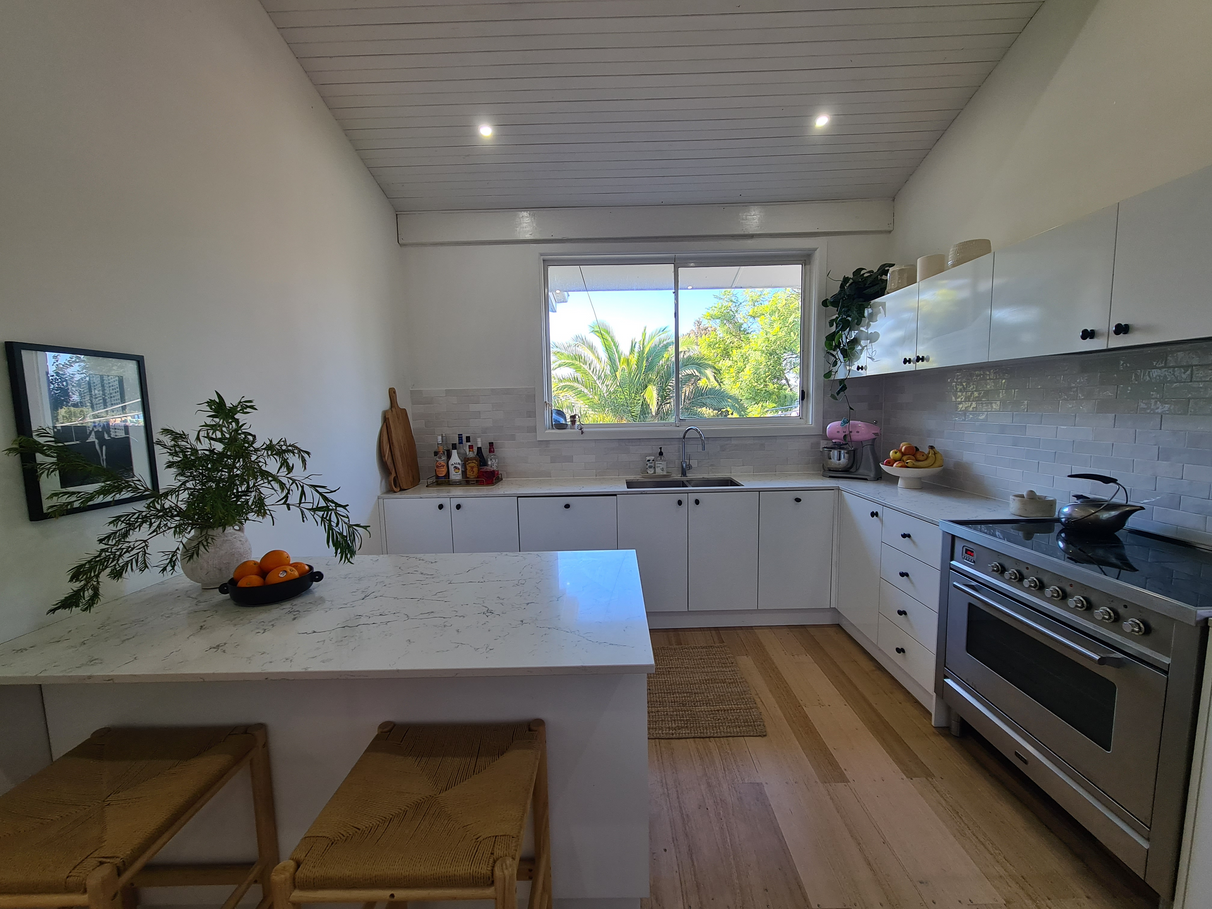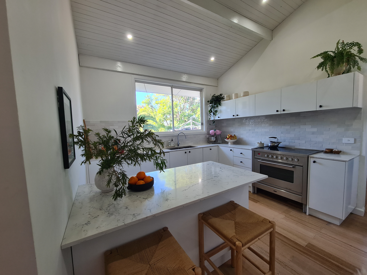 - Large kitchen with raked ceiling, stone benchtops, integrated dishwasher,