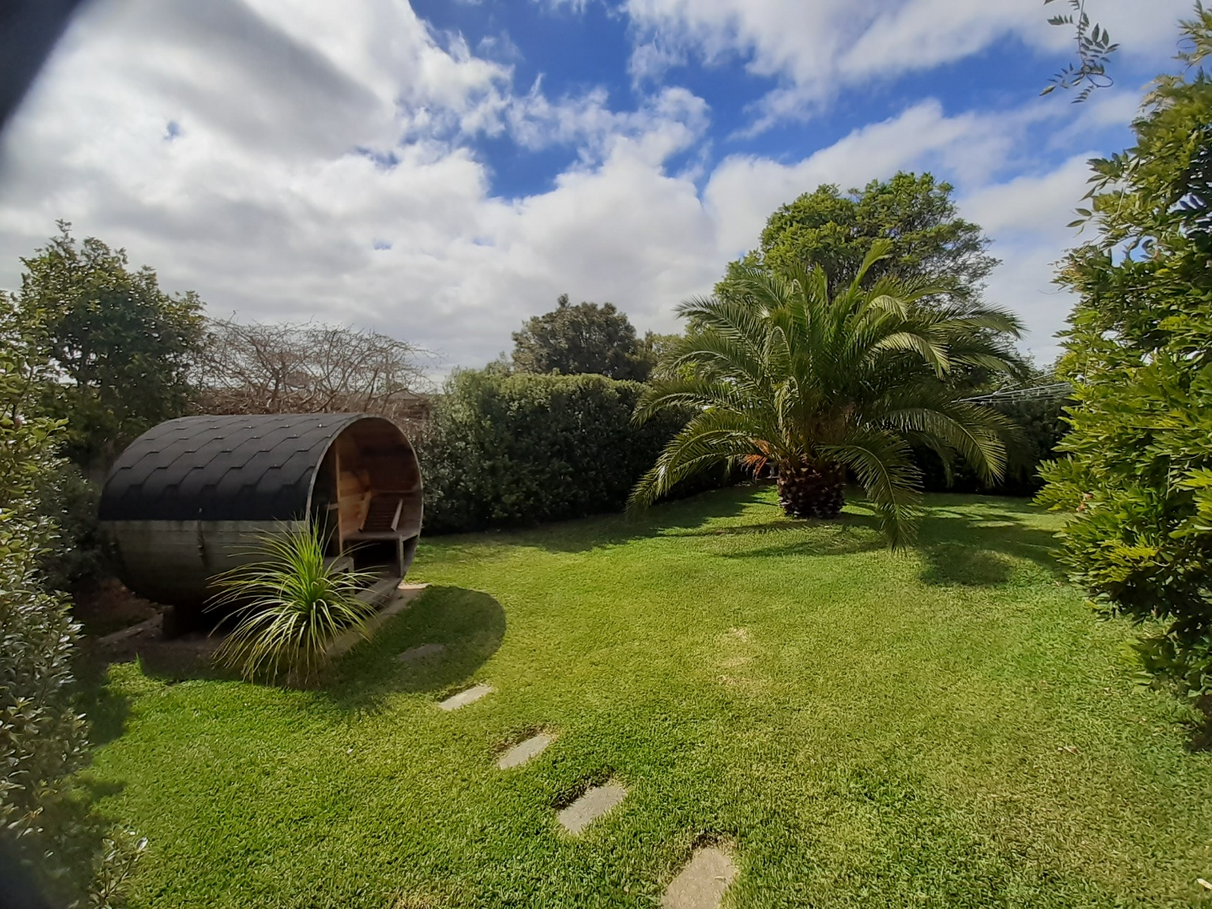 - Private backyard with an expansive deck overlooking a traditional barrel sauna and