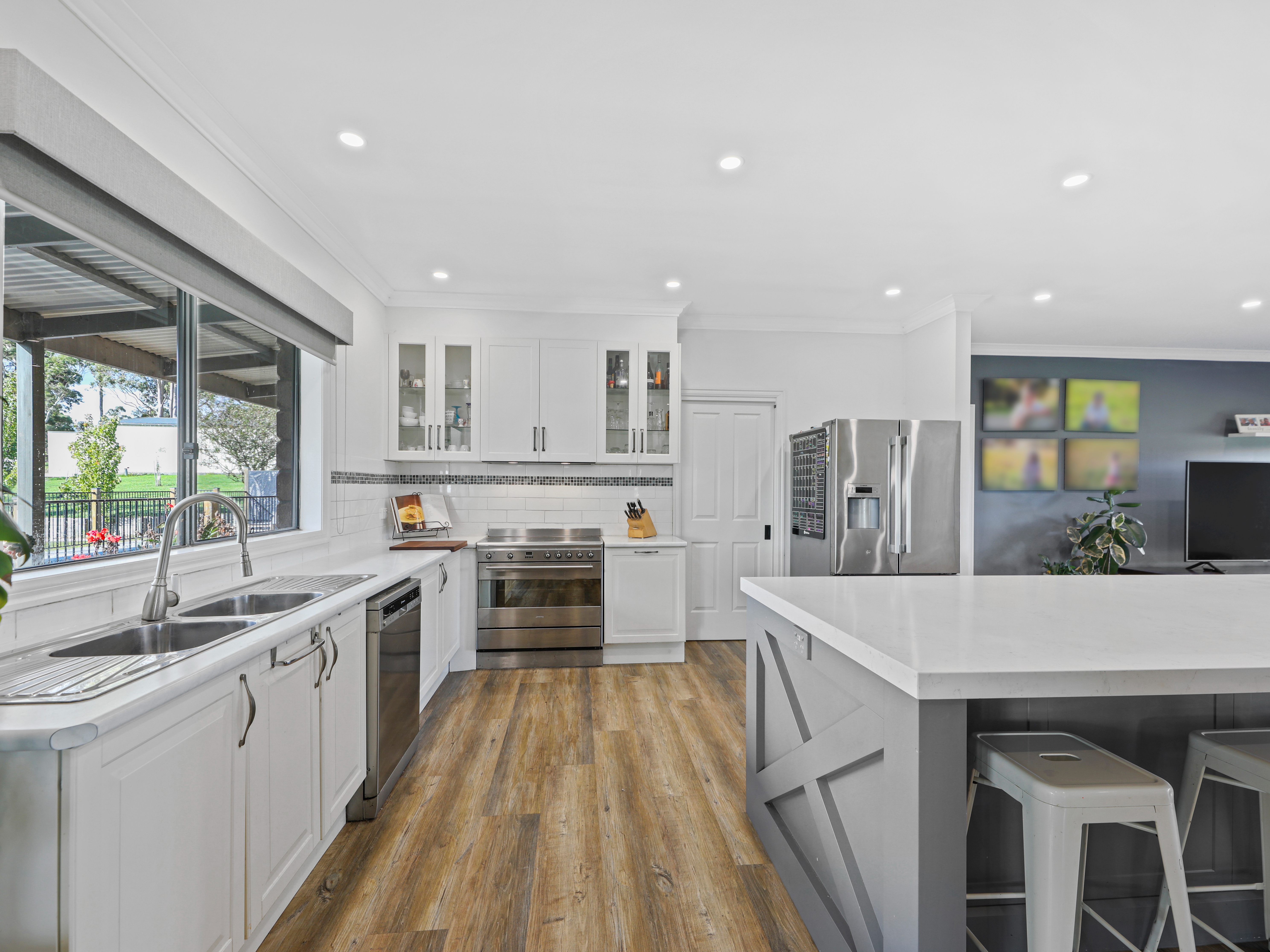 An open plan kitchen boasts quality appliances, a stone bench top to the large island and an enormous walk-in pantry.