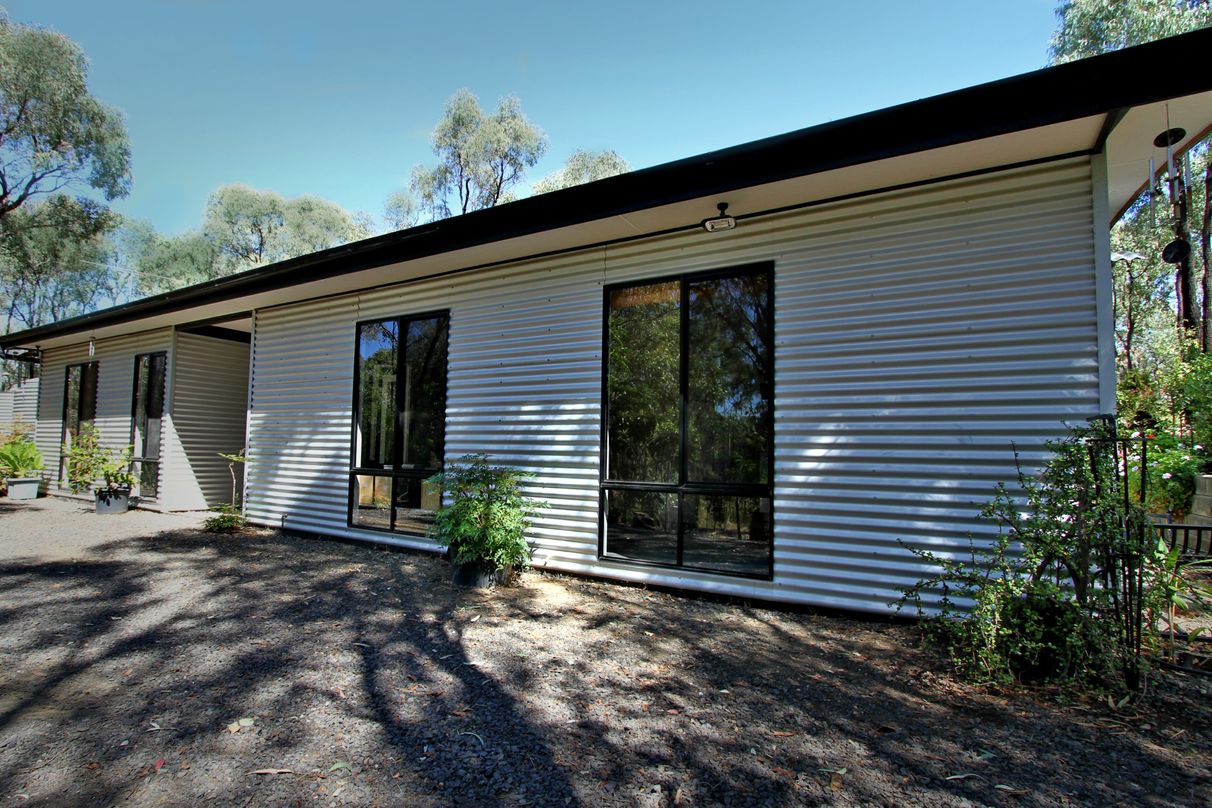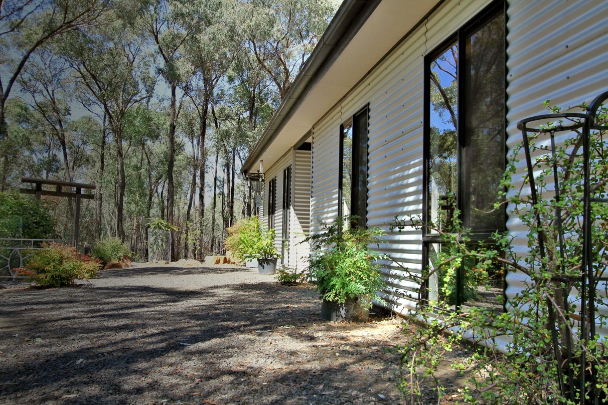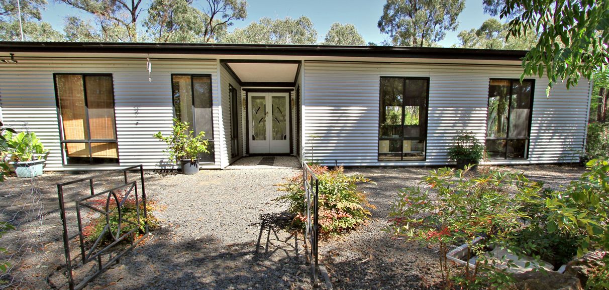 This fantastic 2 bedroom home is bathed in natural light and has stunning internal features from leadlight doors to antique feature lights. Its located on a quiet road 10min drive from Bendigo. The house is a modern looking corrugated iron construction with very low maintenance gardens surrounding the house on a 5 acre bush block.