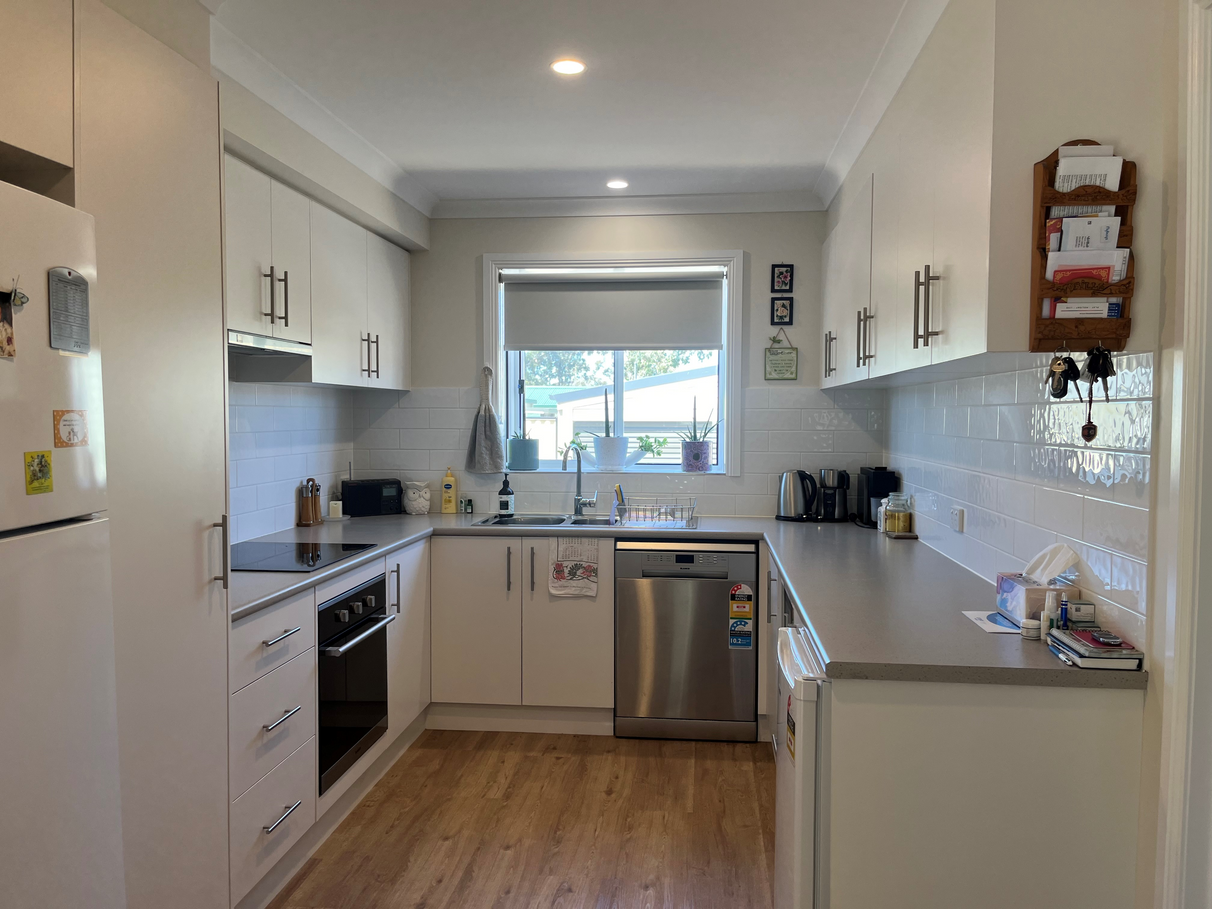 Inside you will find 2 good sized bedrooms with bay windows, built-in robes and ceiling fans, a generous U- shaped kitchen with dishwasher and a large open plan living/dining area with a split system. The flooring consists of a light-coloured vinyl through the open plan & bathroom areas with cosy carpet in the bedrooms.
