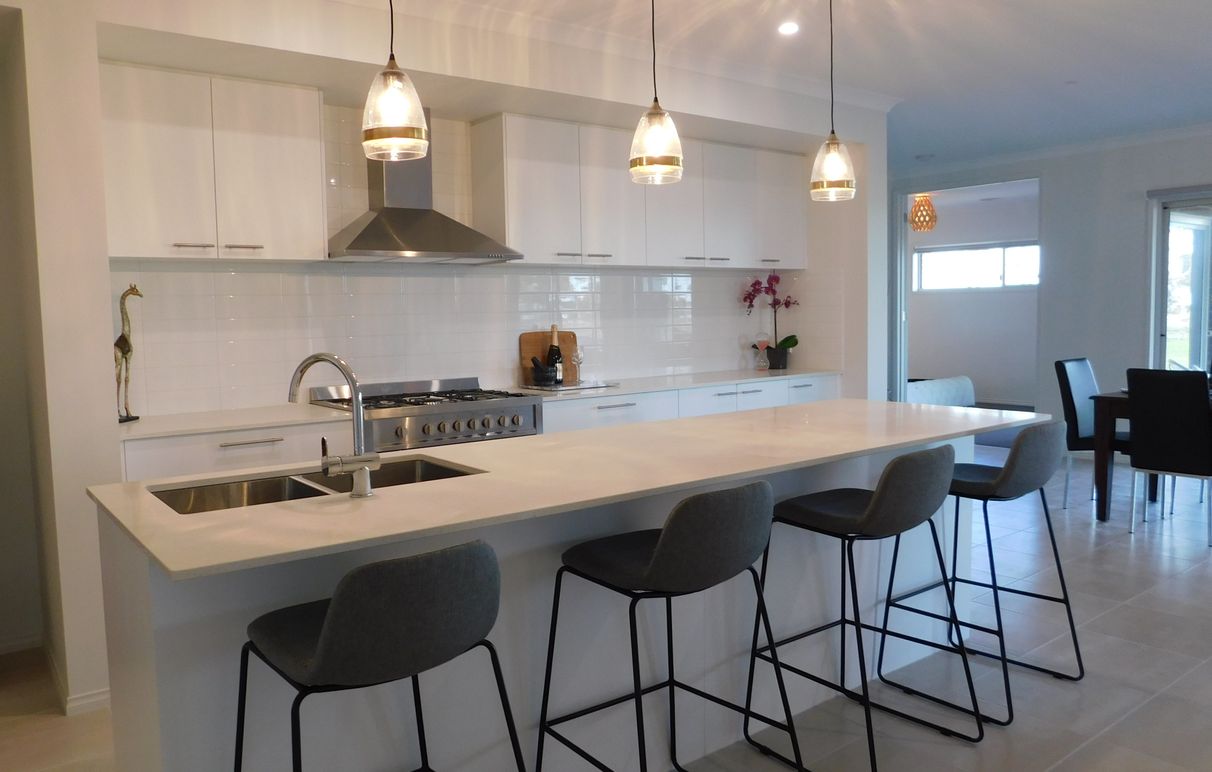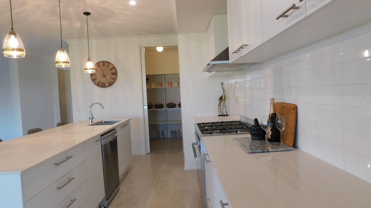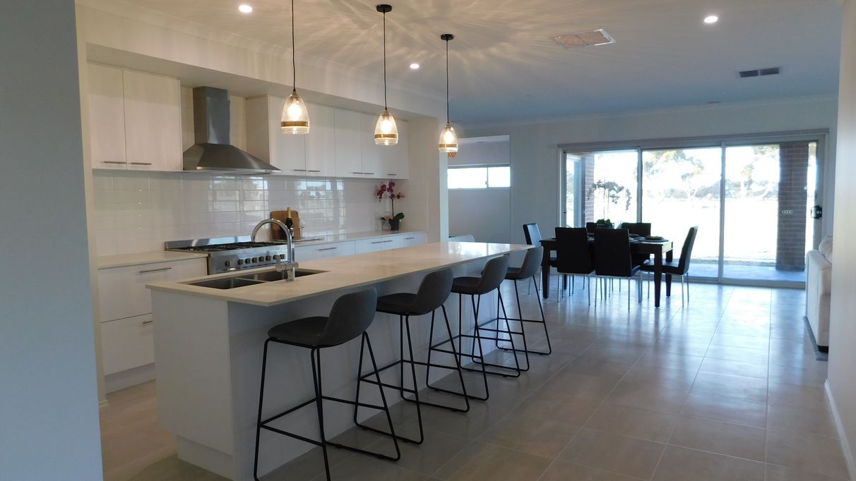 Open plan large kitchen with extra-long island bench for entertaining with ample cupboard space and extra wide draws along with extra-large WIP, freestanding oven with gas cooktop.