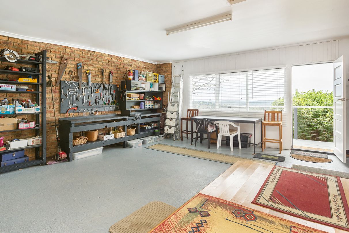 The large under roofline garage and workshop/studio has direct access into the house and out onto the deck, picture windows with those great views and could, readily, be converted to a different living space.