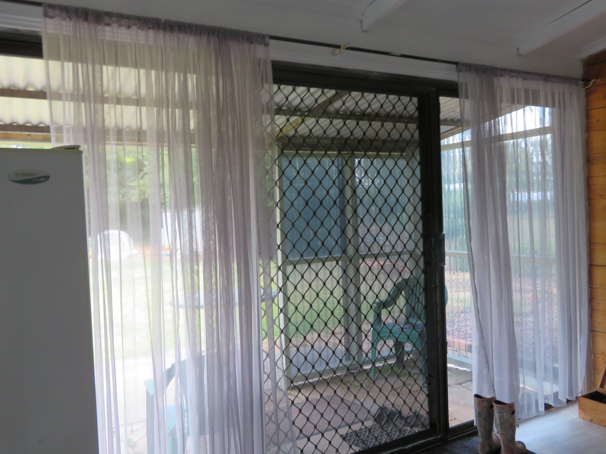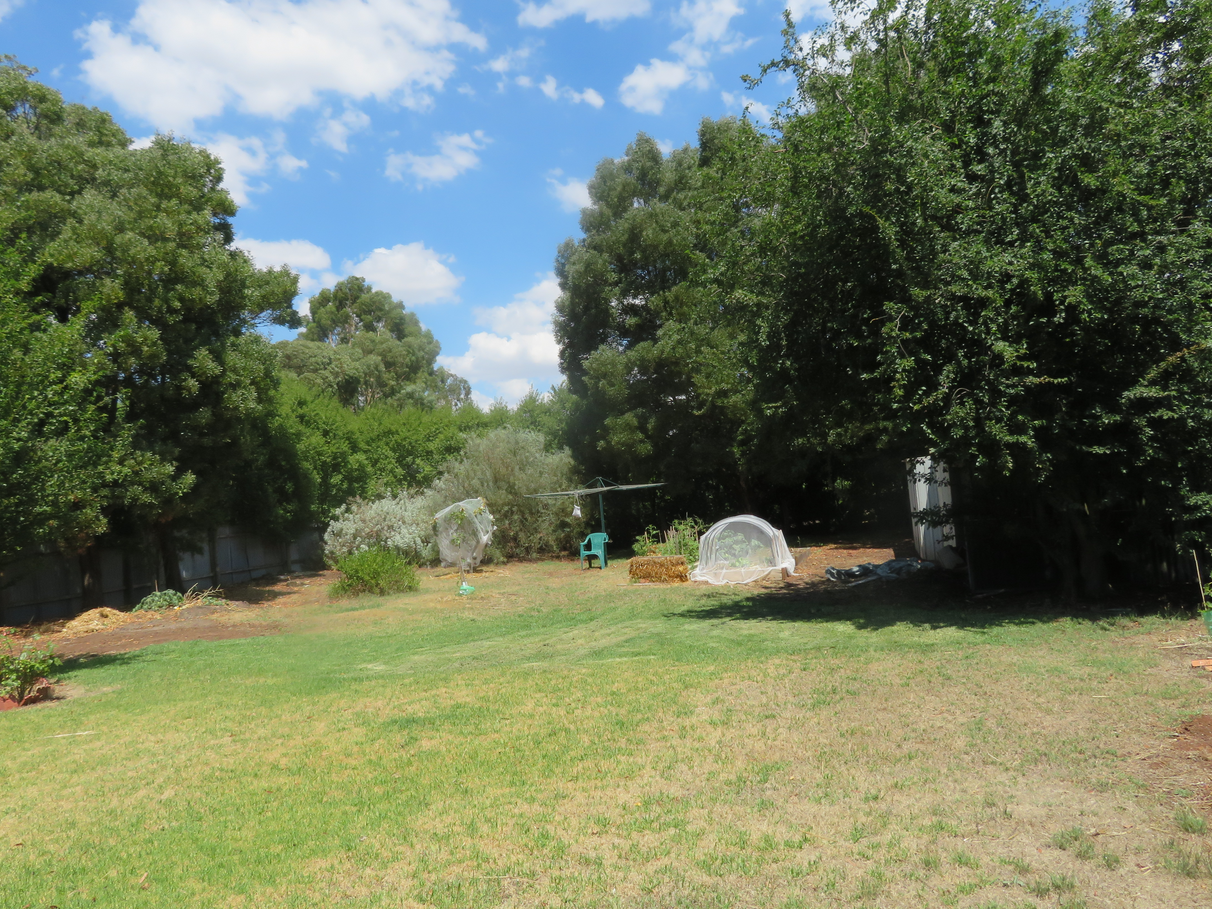 Patio at the back with a cosy corner, looking at a large backyard, fruit trees & veg. planters. Wood, garden & storage sheds.