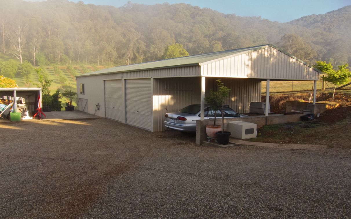 Situated 12 metres from the western end of the house, there is an all-steel structure on a concrete floor slab with a gable roof measuring 15.2m x 7.5m. It comprises four bays each 3.8m x 7.5m with the two centre bays each having a roller access door. The western end bay contains two fully lined and insulated office-type rooms, each of equal size. Each has windows and individual reverse cycle air conditioners. The eastern end of the shed has an attached extension 3.8m x 7.5m which provides a gravel-floored carport. This area also contains an overhead moveable block and tackle for handling and moving heavy items.