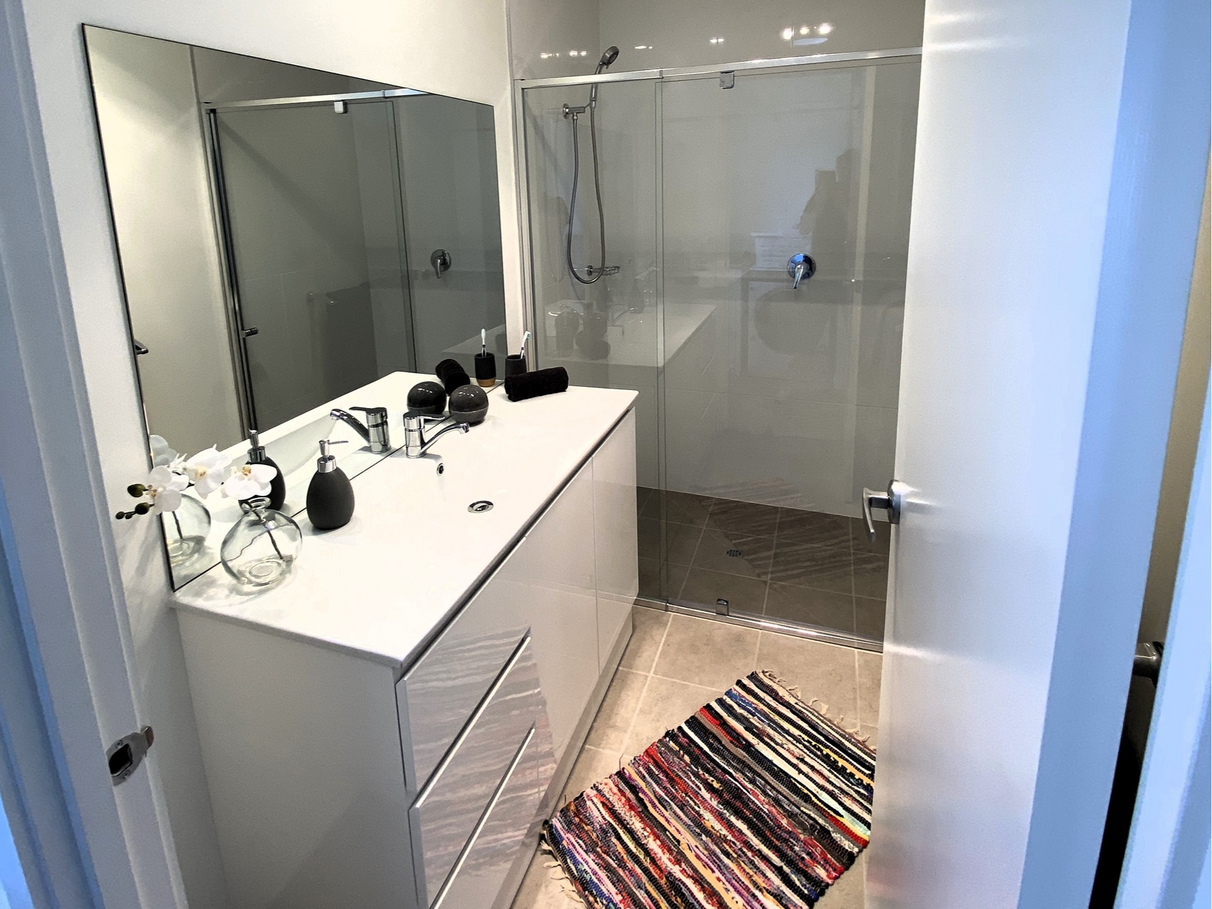 The bathroom is large and is complemented by a full-sized vanity (so heaps of storage) and a massive shower.