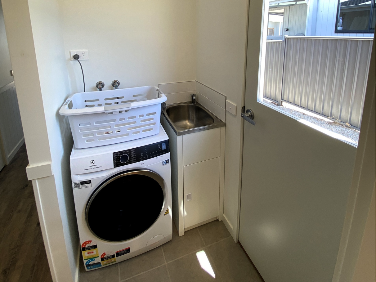 Euro laundry is walkthrough and leads out to the undercover deck and backyard. Storage in the laundry can easily be created by the inclusion of an overhead cupboard which we are happy to discuss.