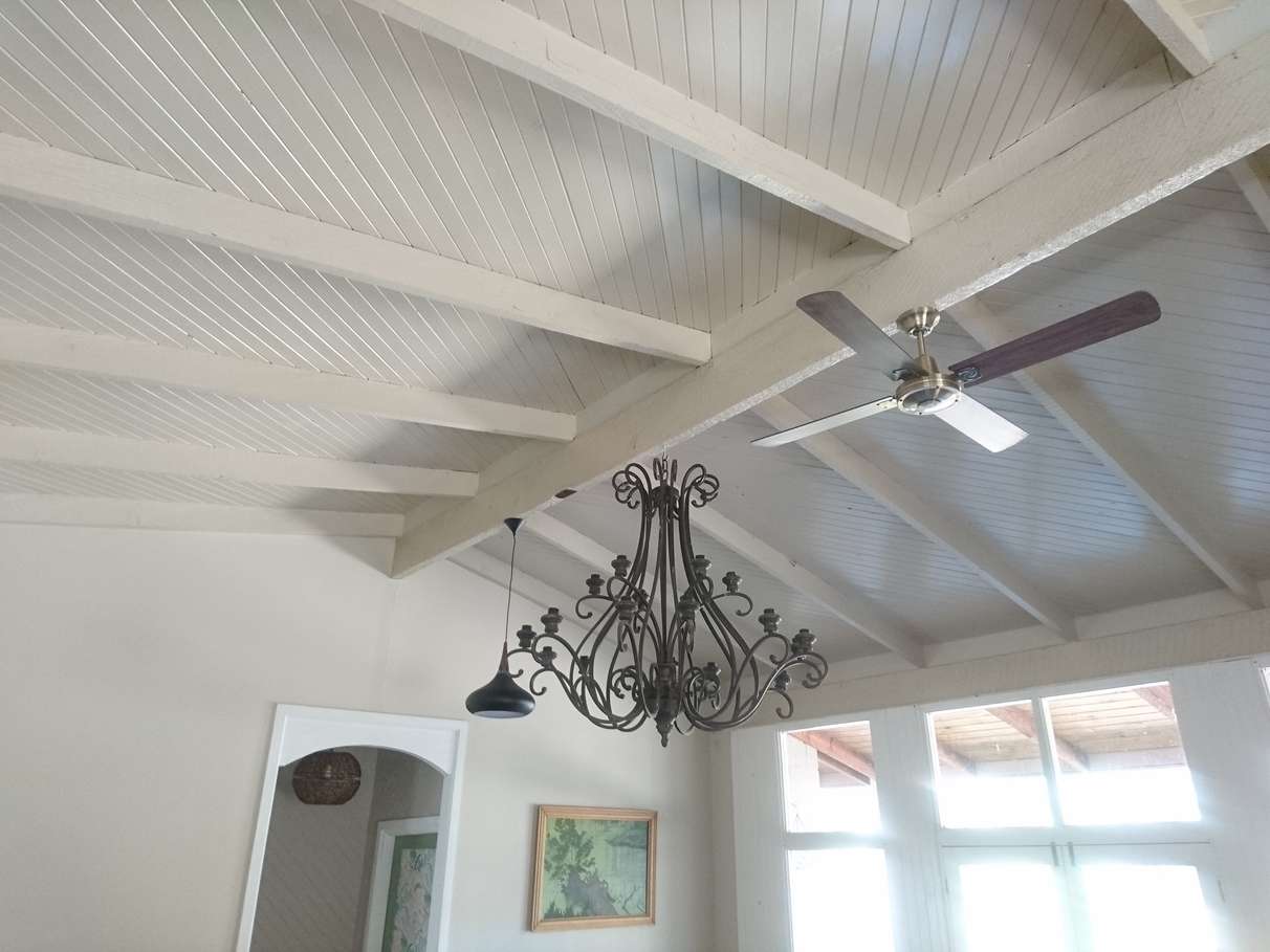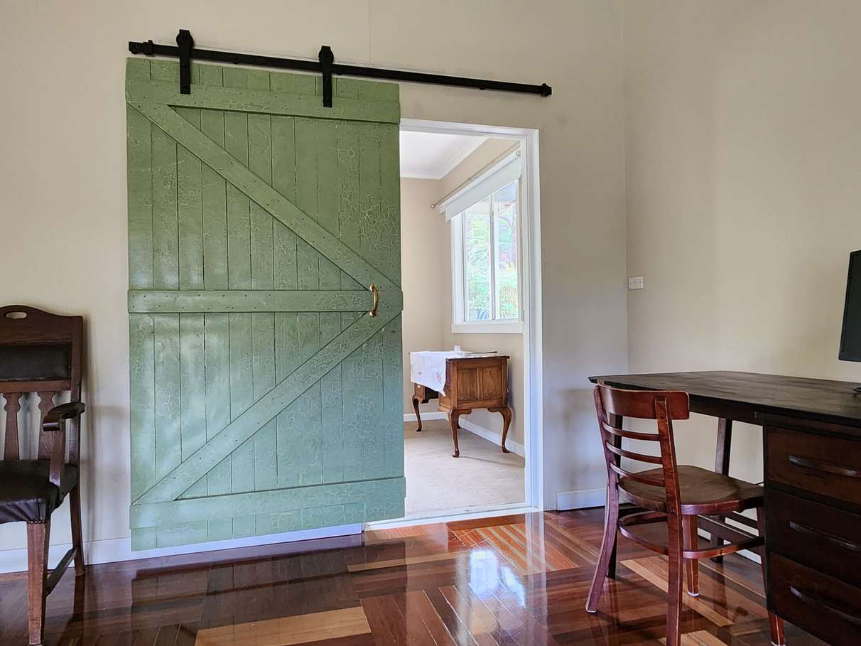 The open-plan living area features timber flooring, a built-in wood fireplace, and a high timber-beamed ceiling with a chandelier centerpiece. French doors open onto the shady porch. There are three bedrooms, all of which face into gardens, and two rooms have antique feature doors out to the garden.