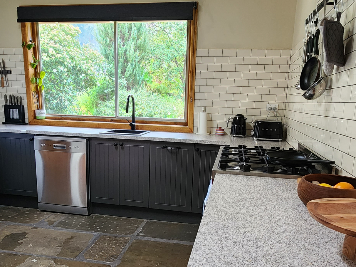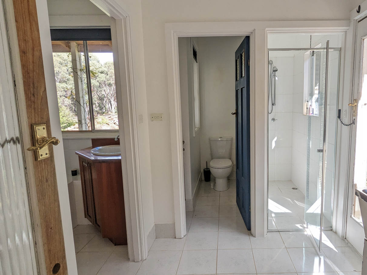 The laundry, bathroom, and toilet are a designated area, with a large shower, bathtub, and timber vanity. The kitchen features slate flooring, custom walnut standalone pantry, and chef-standard appliances.