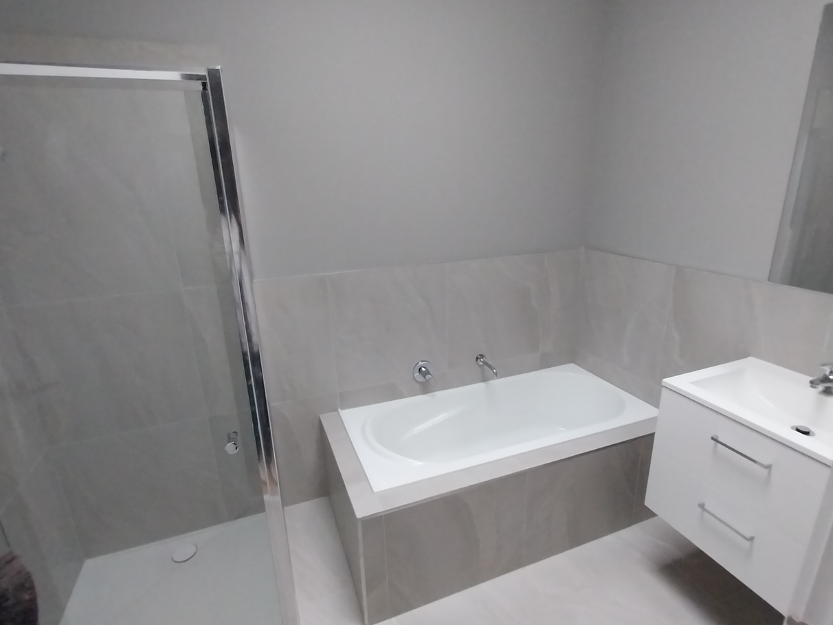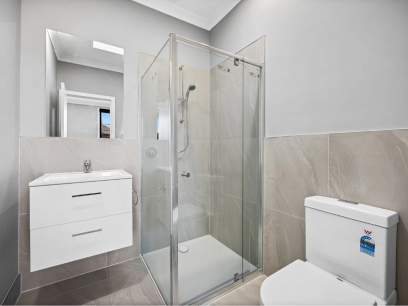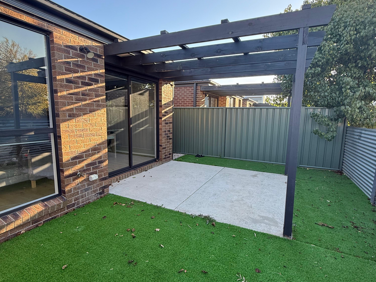 Indulge in relaxation within the chic bathroom, complete with a shower, luxurious bath, and sleek vanity. The laundry, conveniently located, offers practicality with a single trough, space for a washing machine, and built-in storage, seamlessly integrating functionality with style. Central heating throughout the home ensures year-round comfort, while the fully fenced low-maintenance backyard beckons for outdoor enjoyment, featuring an undercover pergola and synthetic grass.