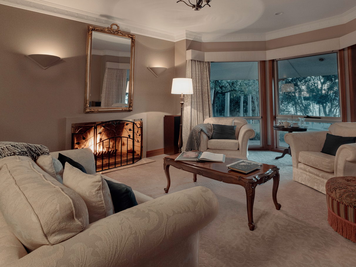 A formal lounge and dining space offers elegance and warmth, complete with custom cabinetry, a classic fireplace, and French doors that open to view the pool terrace and panoramic lake backdrop — perfect for long evenings by the fire or sunset drinks with friends.