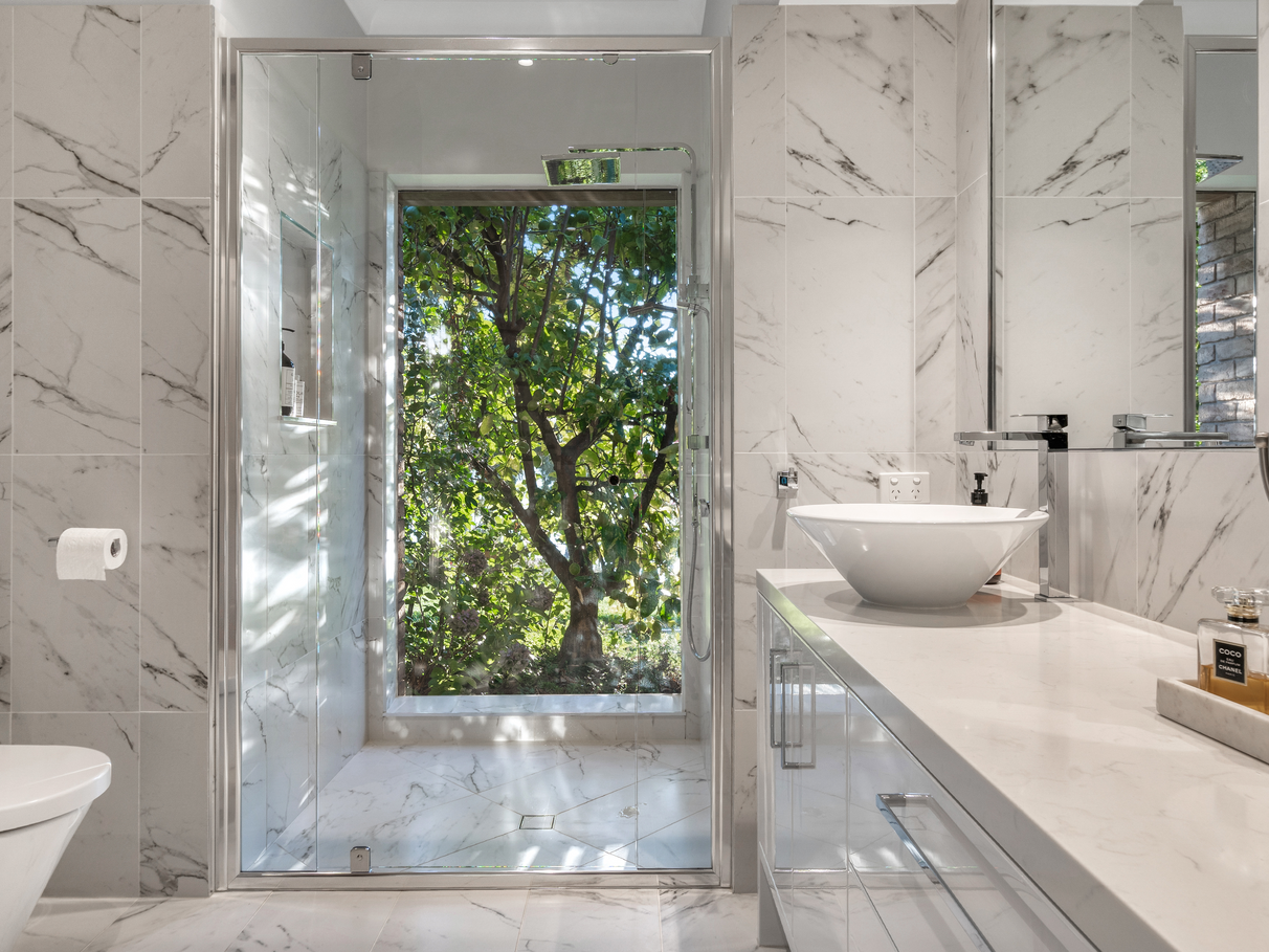 The master suite is a sanctuary of its own: north-east facing, bathed in natural light, and featuring a luxurious ensuite with dual vanities and frameless shower, plus a walk-in robe and adjoining private study.