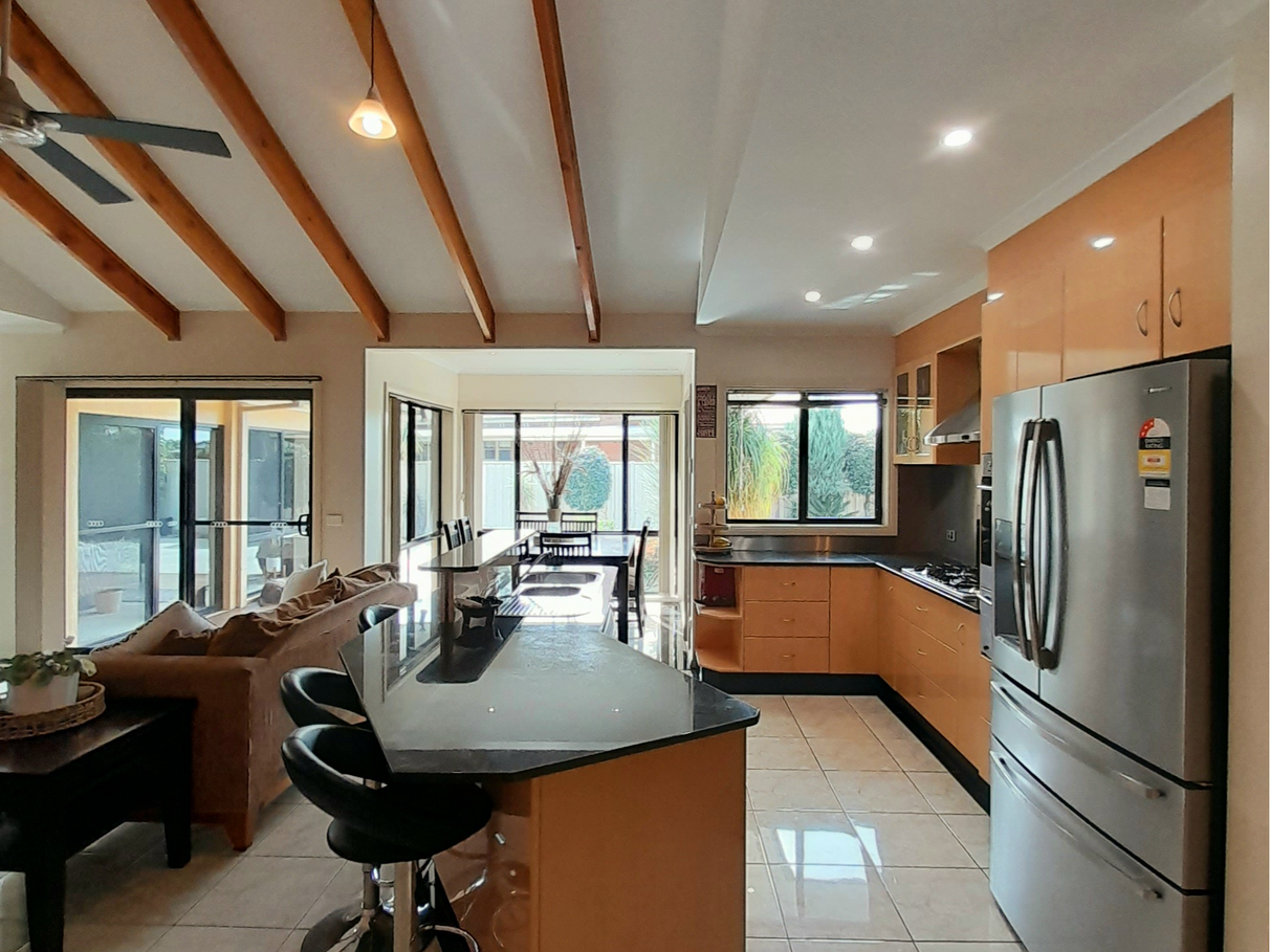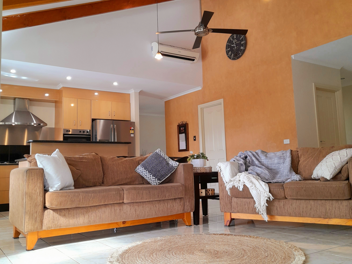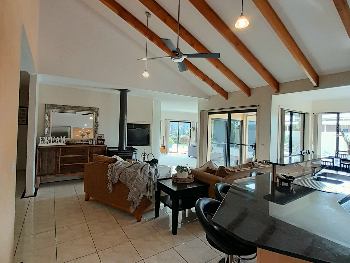 The main kitchen and living area is kissed in sunshine throughout the entire year. The unique cathedral ceilings with exposed beams certainly bring the wow factor. The user-friendly kitchen with granite stone bench tops, 6 burner gas cooktop and electric wall oven. Walk in pantry with enough storage for appliances. Solid fuel heating heats the entire home through winter with the option of a secondary split system located in the centre of the home.