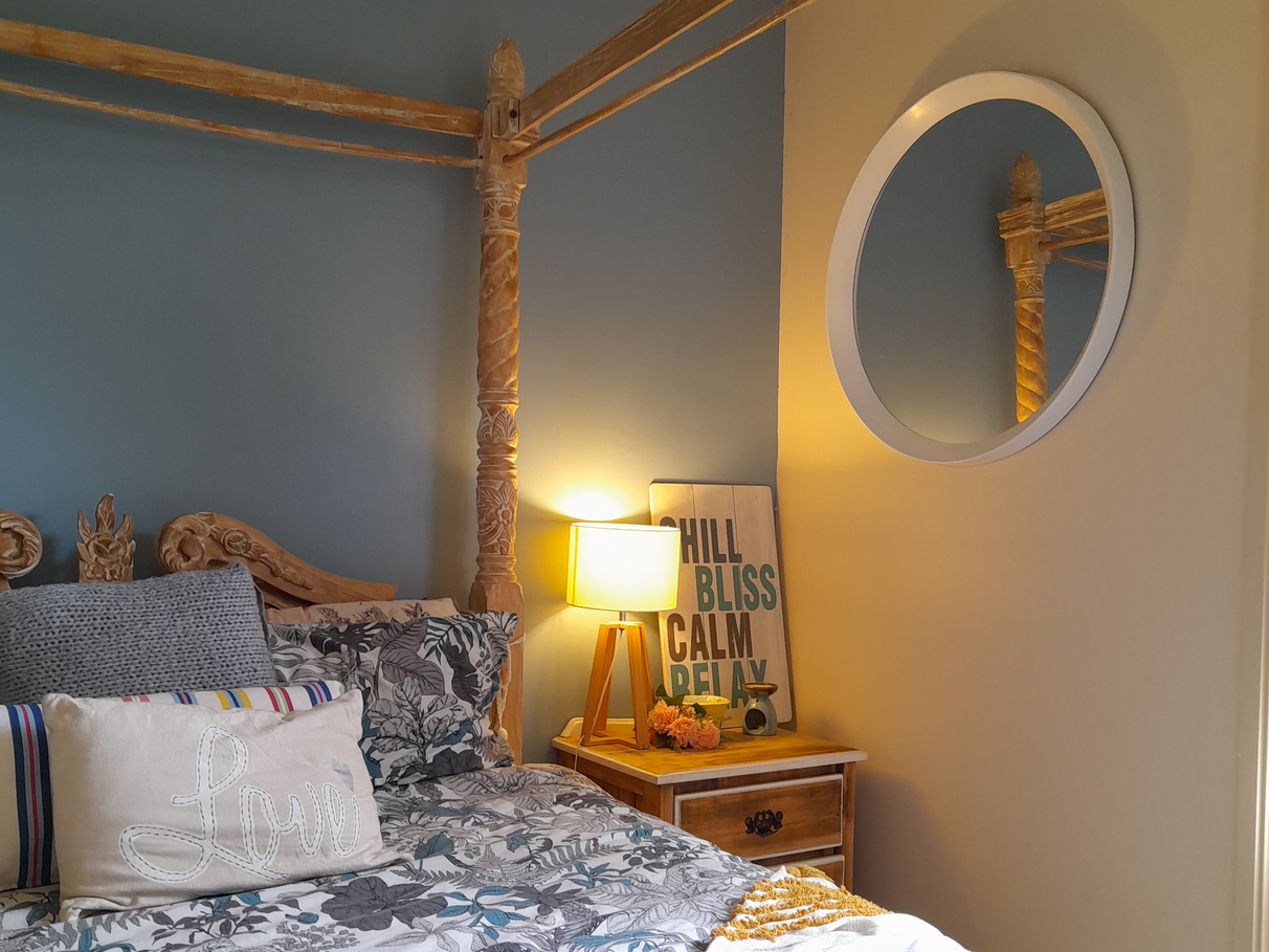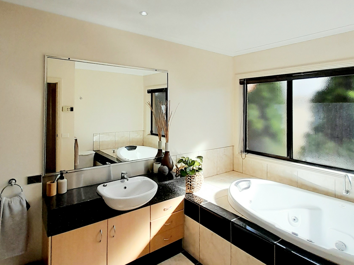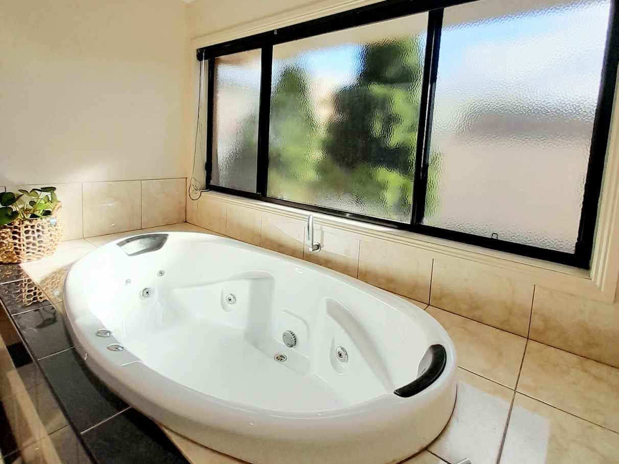 The main bathroom is fitted with a large double spa bath and oversized shower.