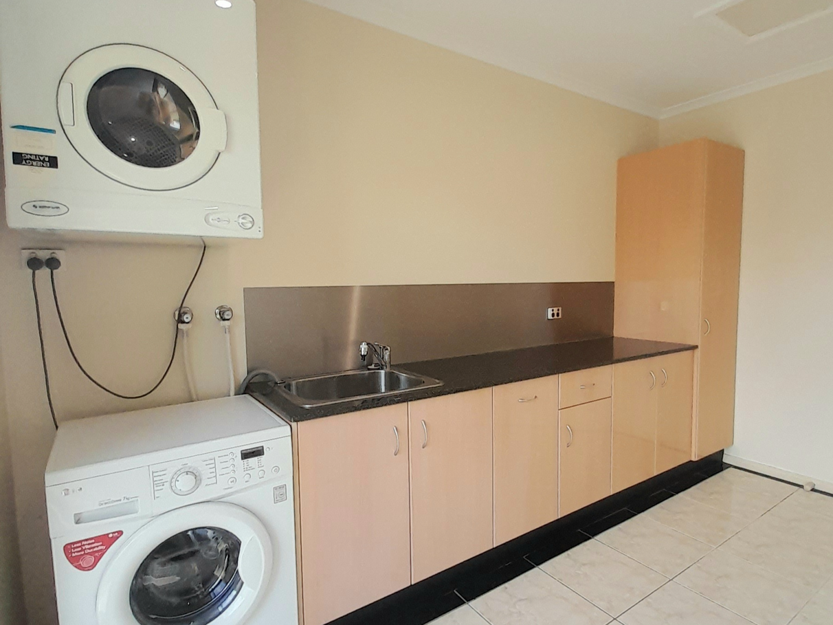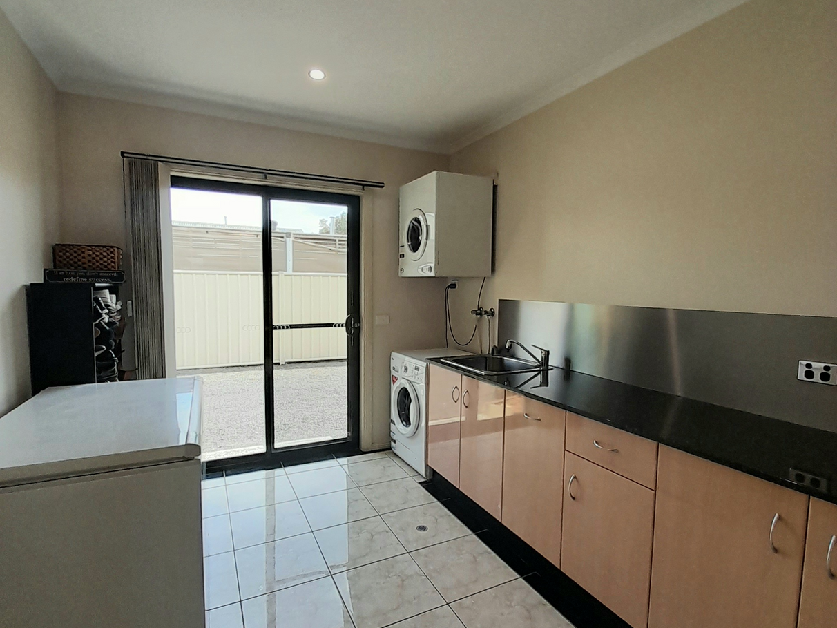 The generous sized laundry has a built-in laundry hamper and ironing board and plenty of under bench storage with also having enough room for a freezer and clothes airer.