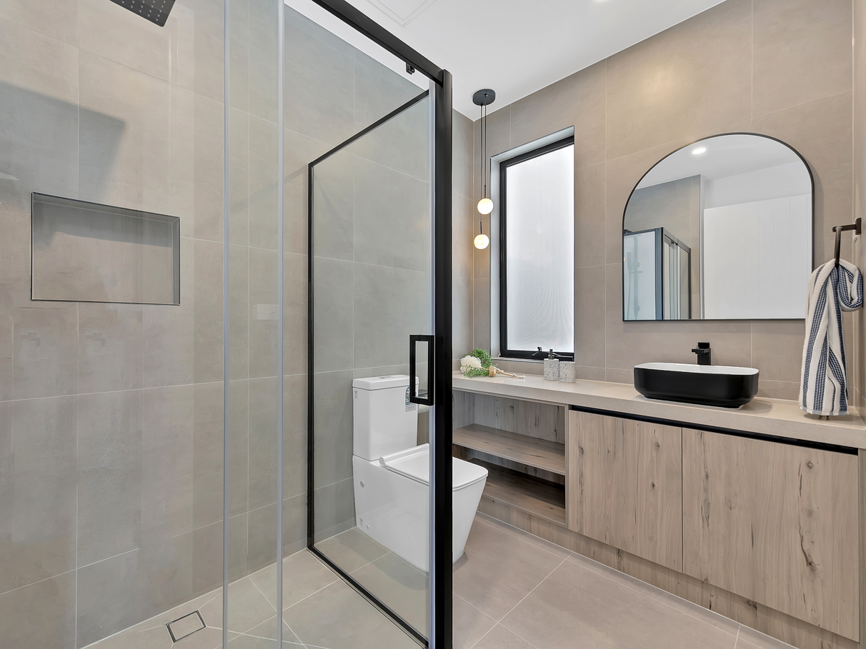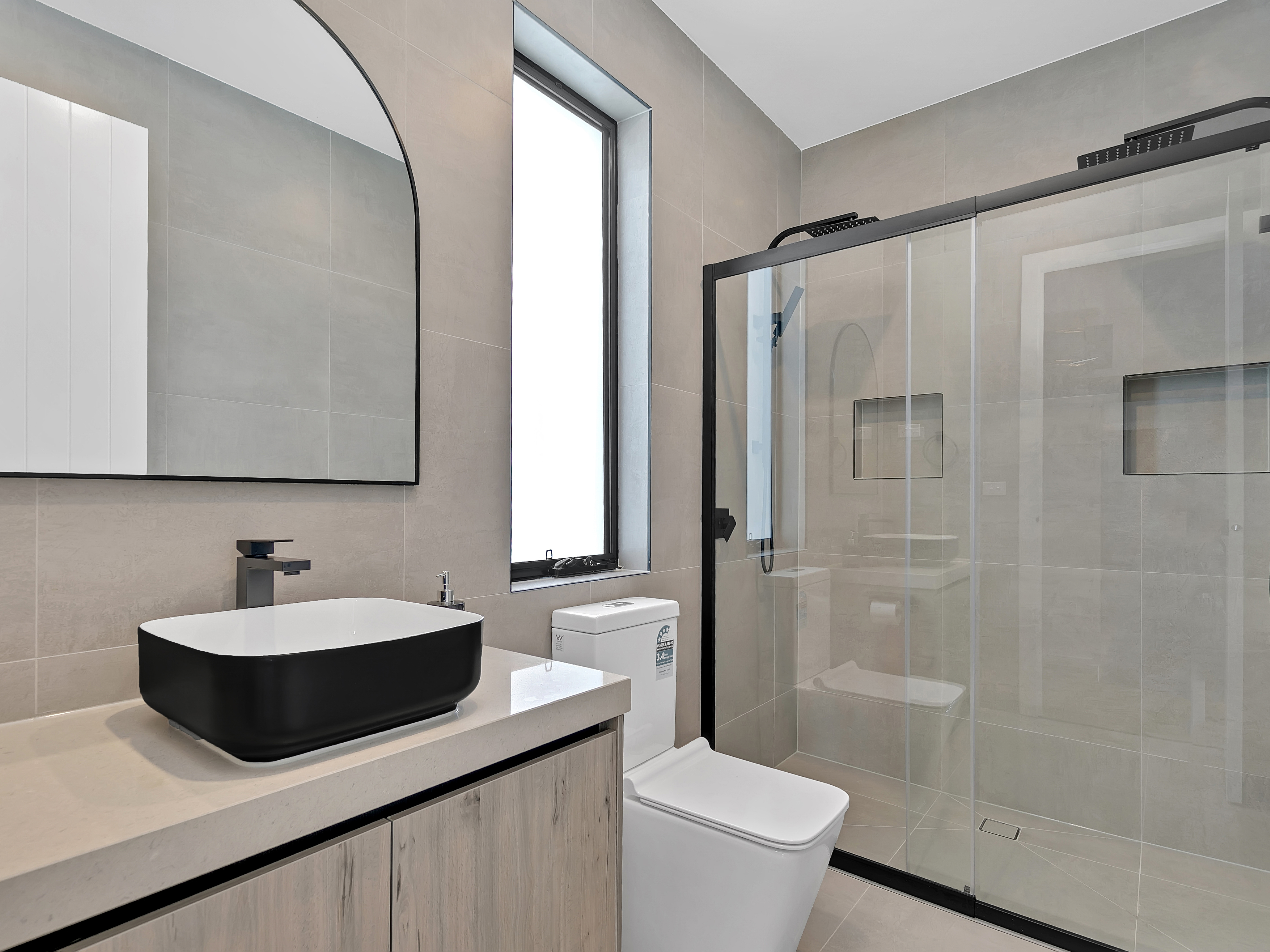 - Elegant black tapware and fixtures throughout.