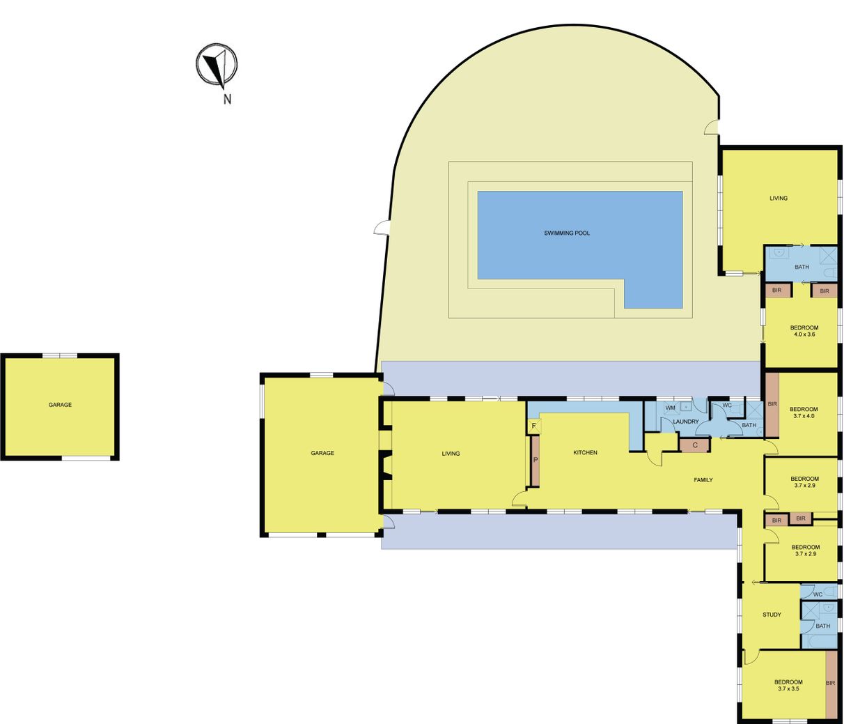 Separate guest wing includes living/rumpus 6m x 6m, plus bedroom, bathroom, overlooking pool
