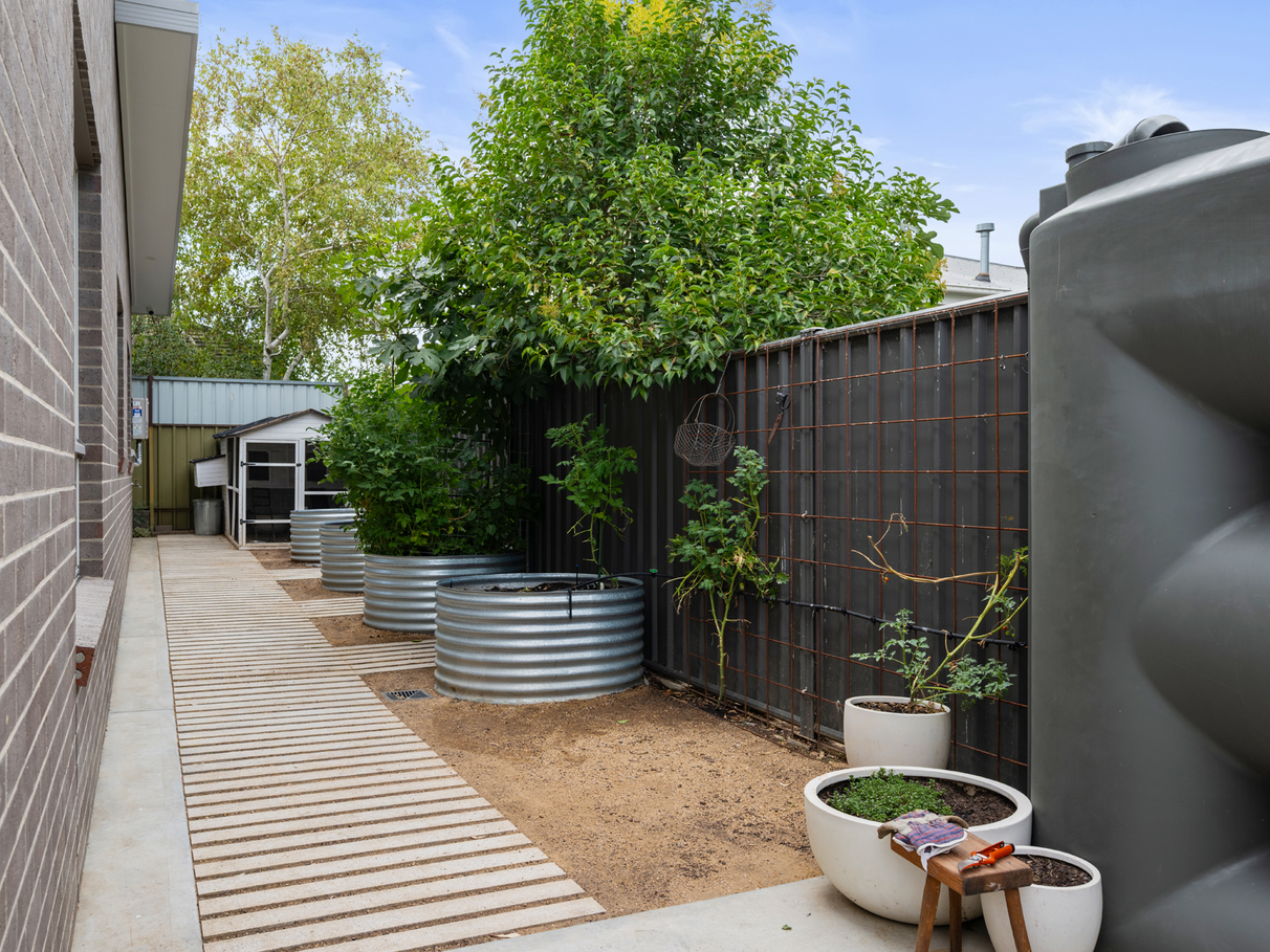 Designed for low-maintenance living, the property is fully landscaped with all native plants, and offers an entirely automated irrigation system that waters all garden beds, raised veggie gardens and lawns.