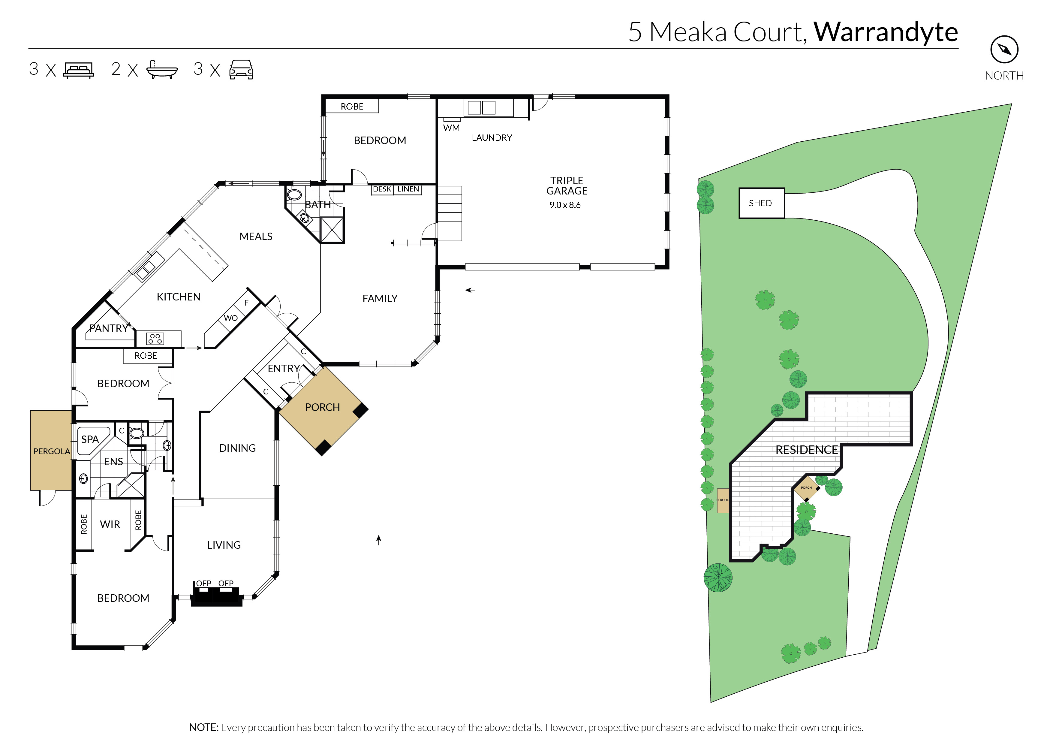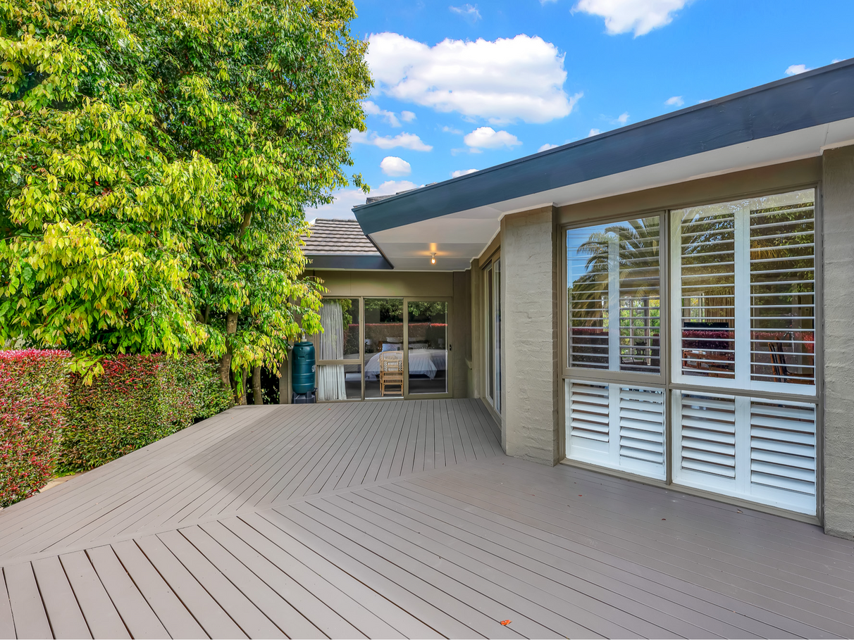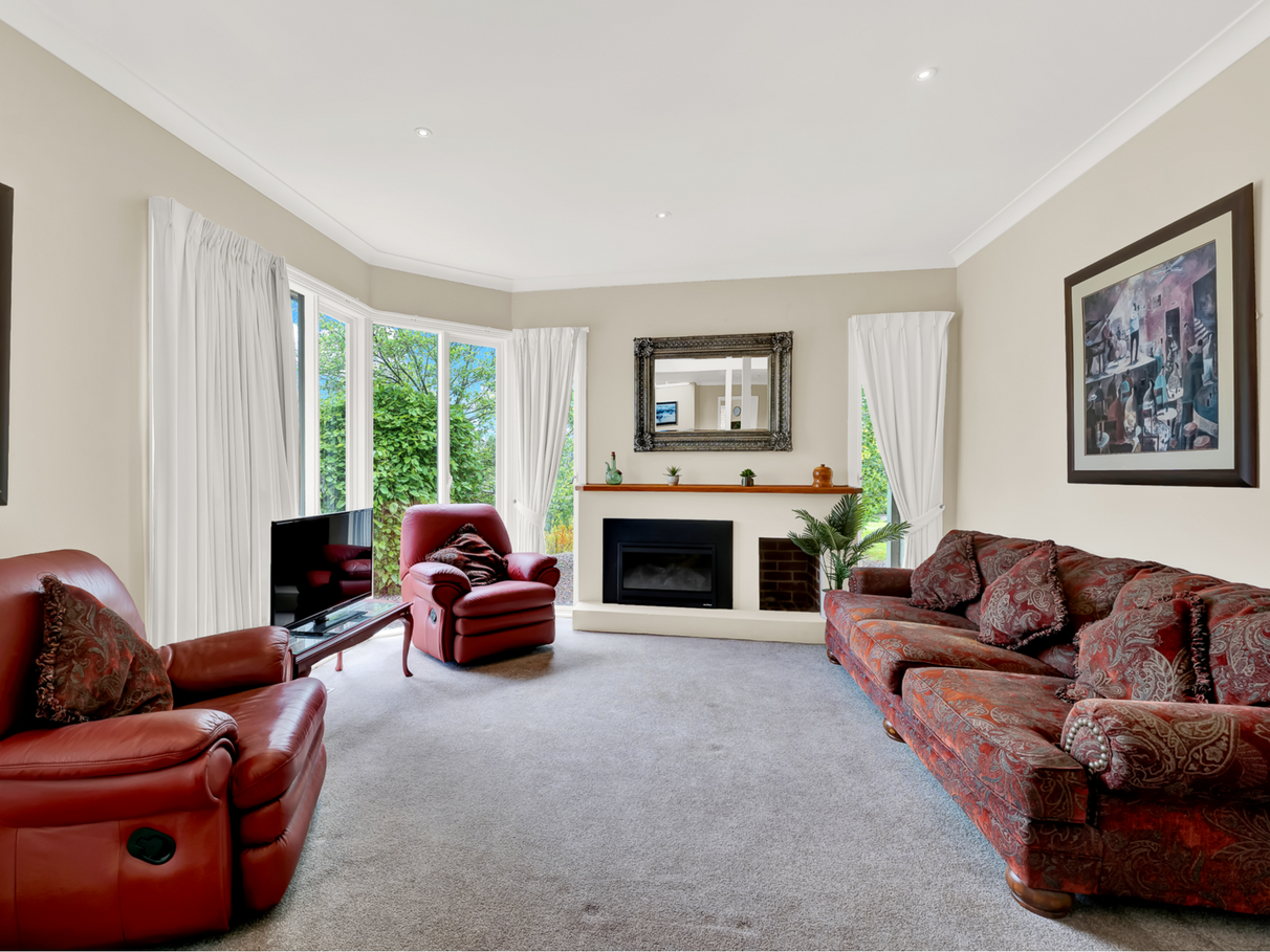 The house has a huge triple garage, ample parking, lush green lawns, with tastefully landscaped grounds. There are two large double bedrooms, one with a large ensuite showcasing a relaxing spa that overlooks a private outdoor oasis. There is a third bedroom, currently being used as a study. The open plan concept of the family room, kitchen and meals area provides an abundance of room and glorious light throughout the hub of the home. The large kitchen is complete with a fabulous walk-in pantry, stainless appliances, broad bench space, and is well positioned to the large outdoor entertaining deck area. The property has ducted heating, split system heating and cooling, and two gas log fires, giving a cosy ambience in the evenings.