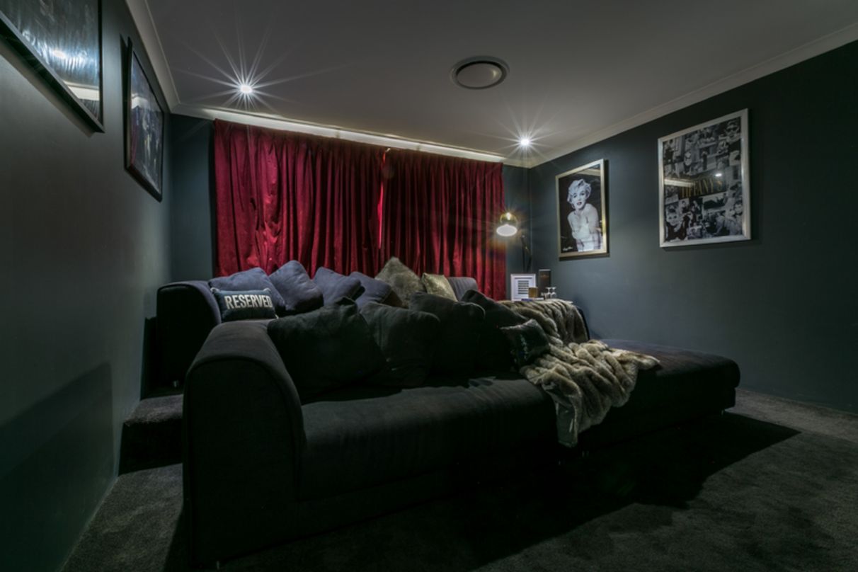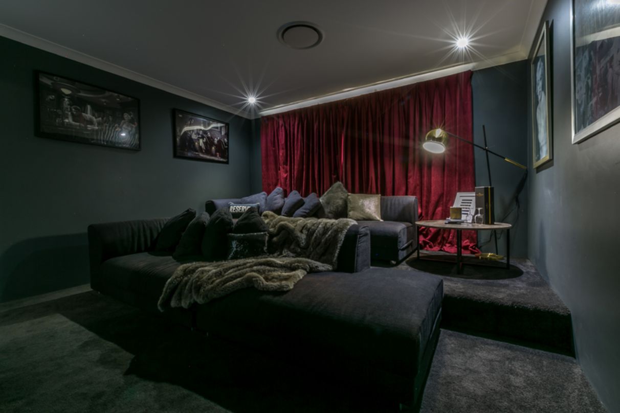 Be entertained in the luxurious dual-level blackout theatre. Deep red drapery falls along the back wall and veil both entrances for the full authentic cinema experience.