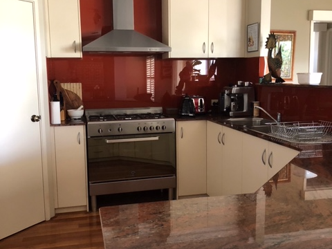 The kitchen has a 90cm gas stove top & fan forced gas oven. There is glass splash backs & granite benchtops for ease of maintenance and a large corner pantry cupboard with ample top storage area.