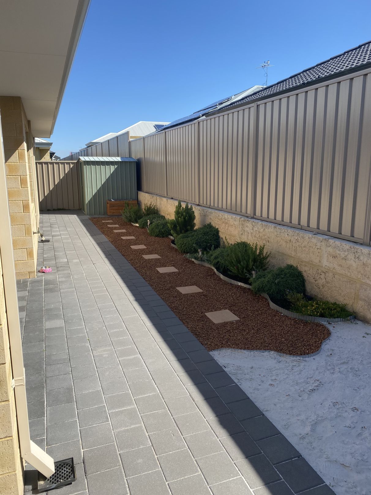 The alfresco and entertaining area is next. Featuring low maintenance artificial turf on the right side, plenty of room for kids to play! The remaining is paved, and completed with low maintenance native plants.