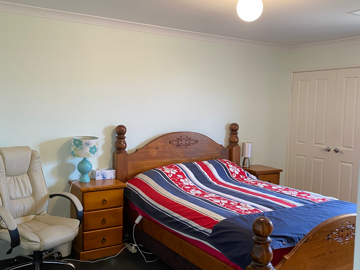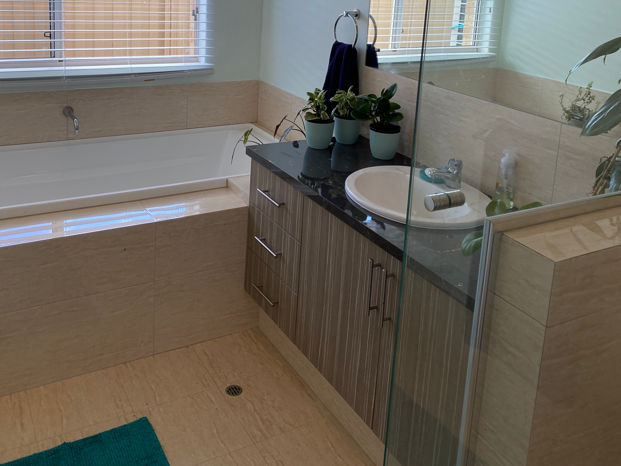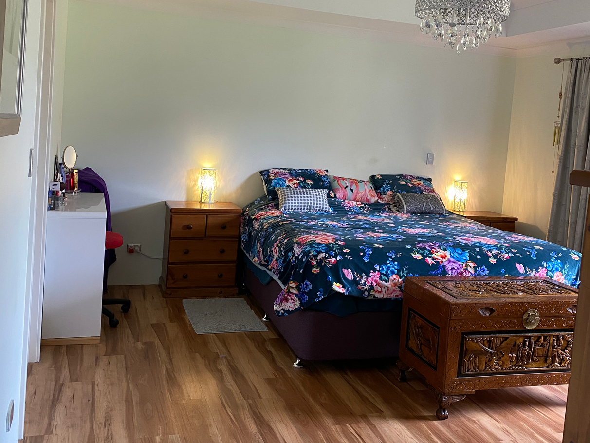 The large master suite is at the back of the house. With trey ceiling and chandelier. Fits super king sized bed with ease. Sliding doors lead out to the paved spa area. There is a very generous WIR. The ensuite has a double shower, large oval bath big enough for two and a seperate toilet.