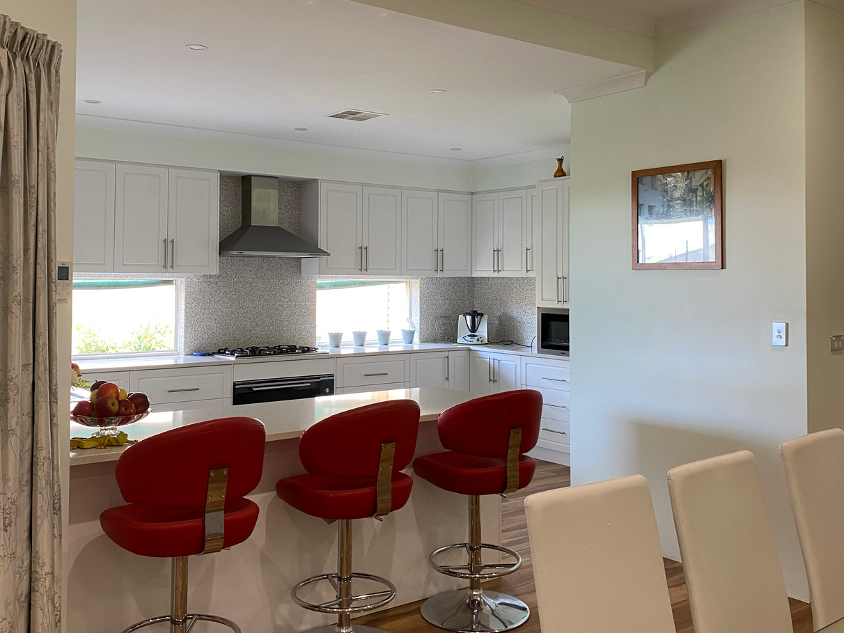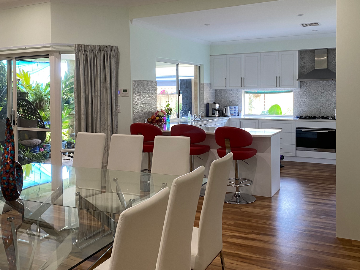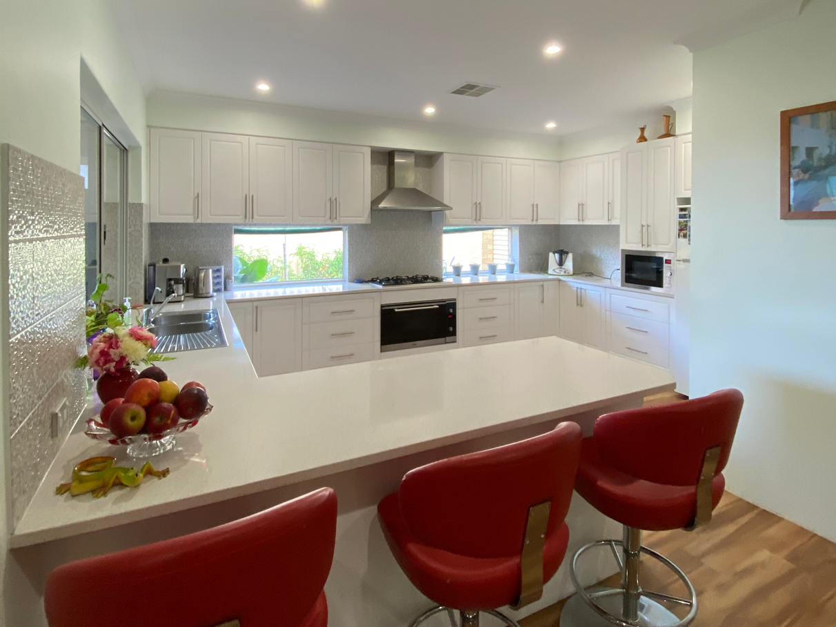 Mountains of storage and metres of essastone benchtops. Microwave/ oven/grill/convection Plus wide oven with 5 gas burners. Dining area large enough to fit 12 comfortably for dinner with room to spare. Family area has a large wall mounted TV.