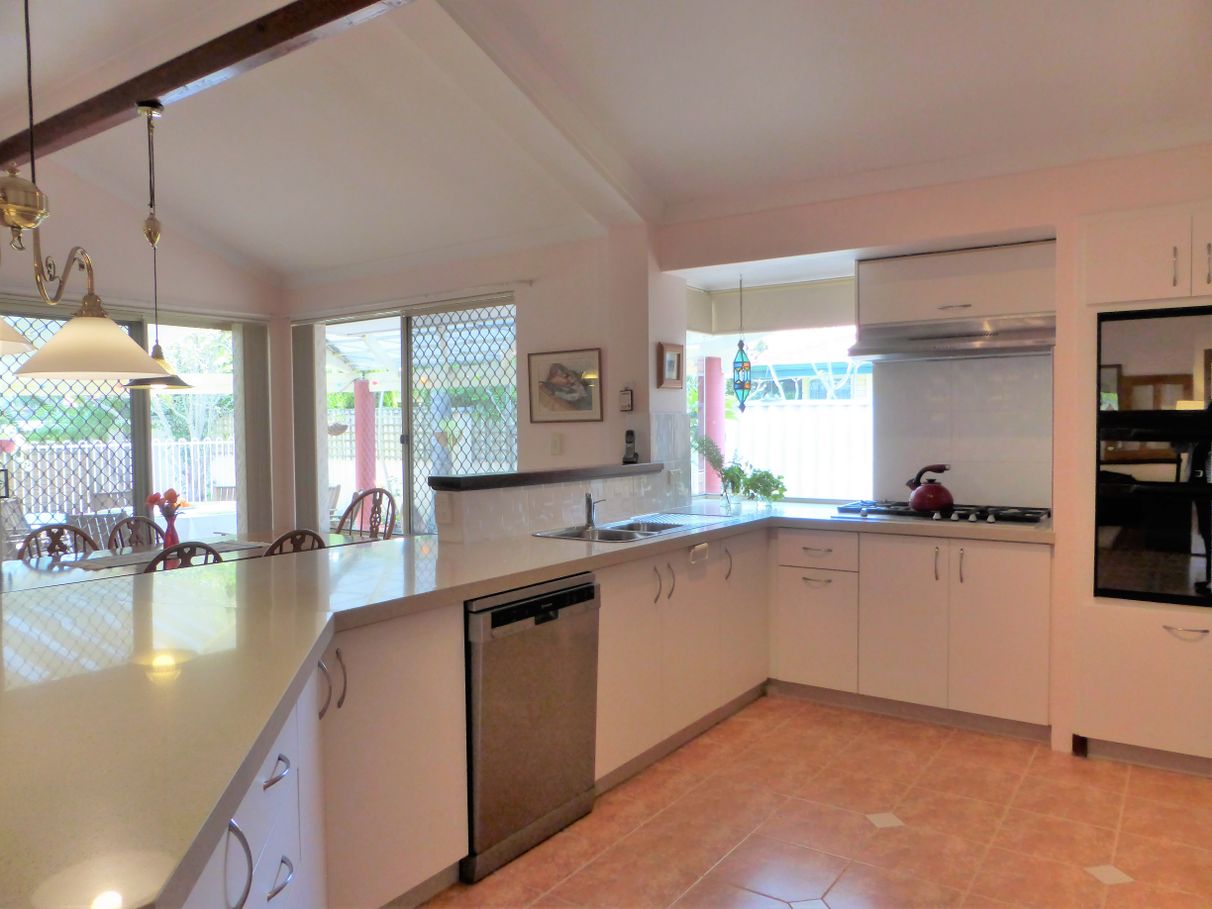 • Renovated Chef’s kitchen with overlaid Essastone bench top, Westinghouse stainless steel dishwasher, gas cook top and range hood with plenty of natural light.