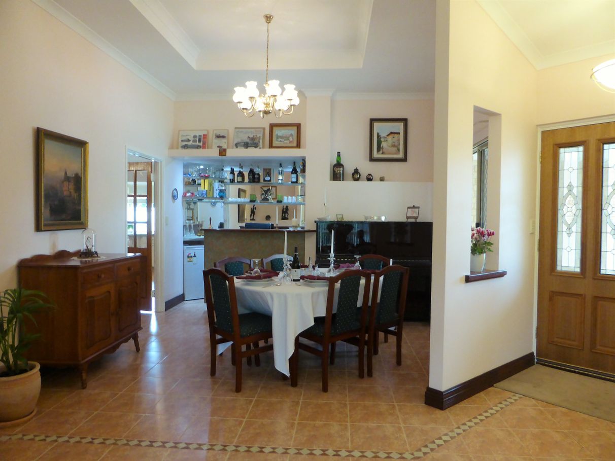 • Formal dining space with coffered ceiling, built-in mirrored bar, bar fridge space and vertical blinds.