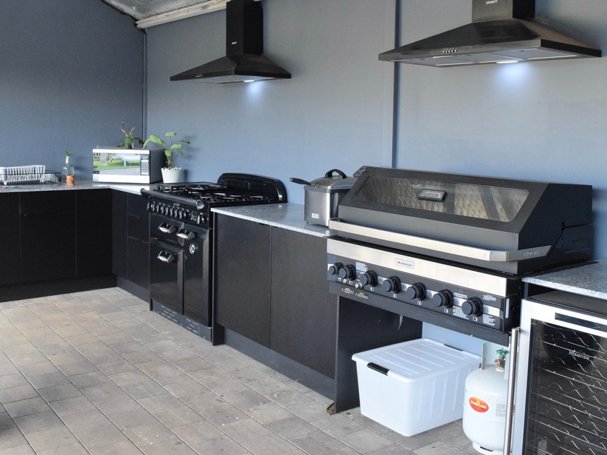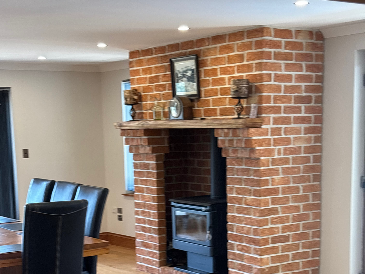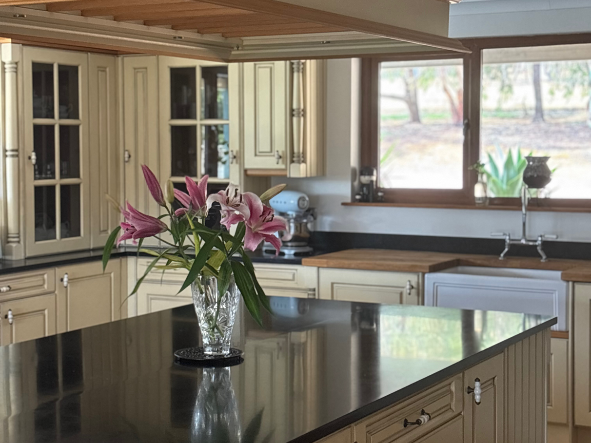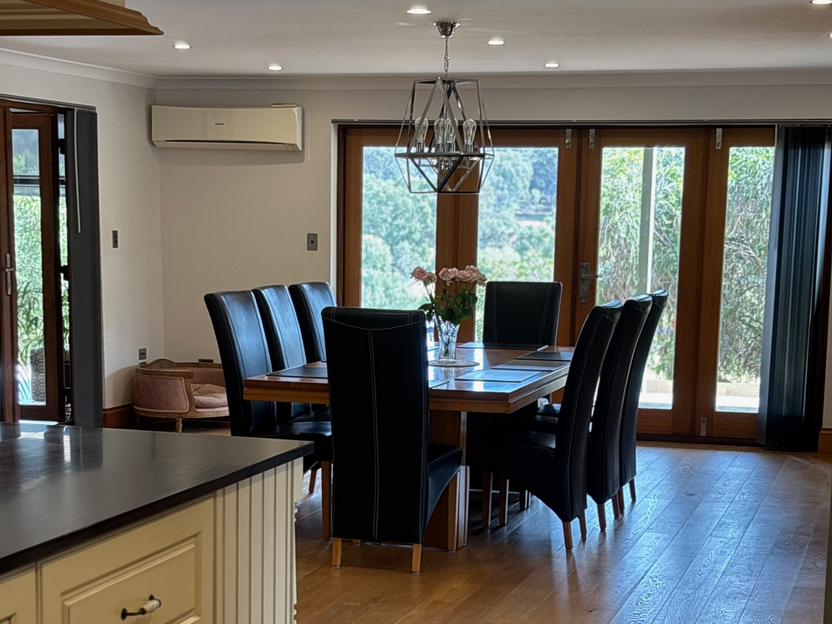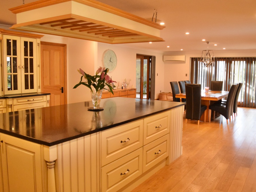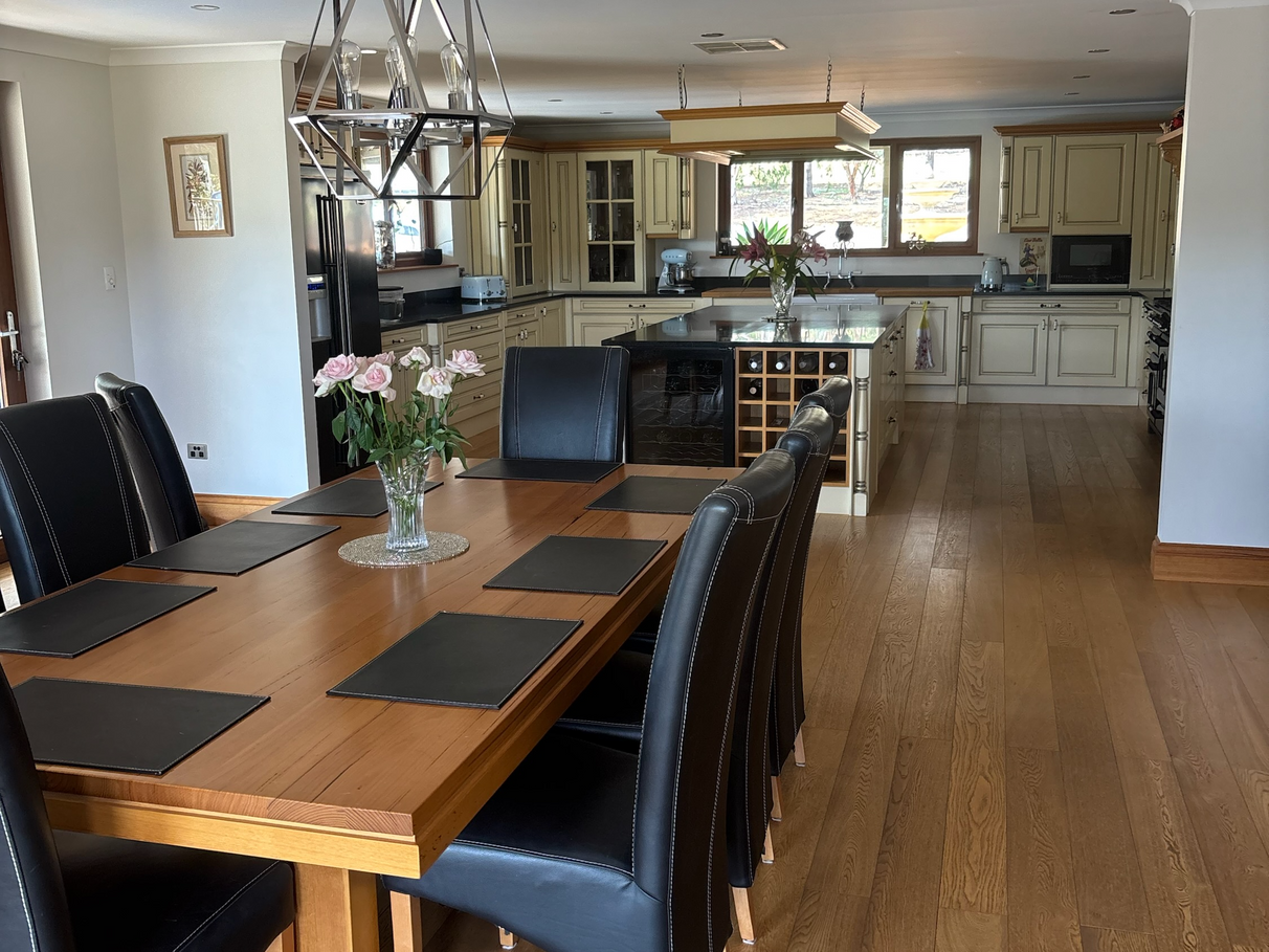 Furthermore, a large kitchen with a central island bench and top of the range appliances, with ample cupboard space, joining the dining area create an inviting space for culinary endeavors and shared meals, completed by an open fireplace.