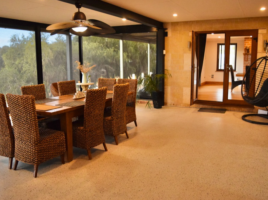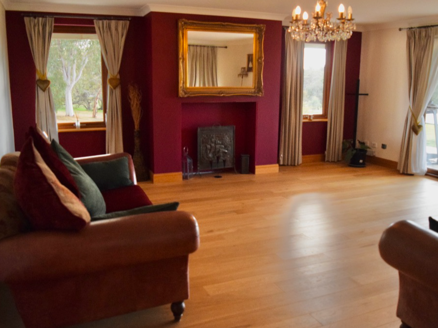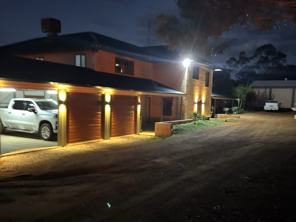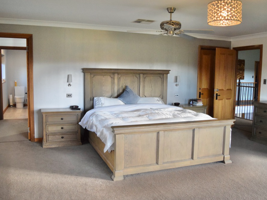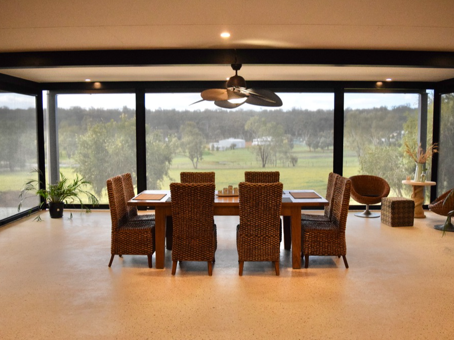 The open plan stair case allows light to flow between the two levels, the upper level leads on to a balcony looking out to the open paddock and as far the eye can see. Down stairs is the main lounge and a formal lounge which leads off into another room looking on to the paddock.