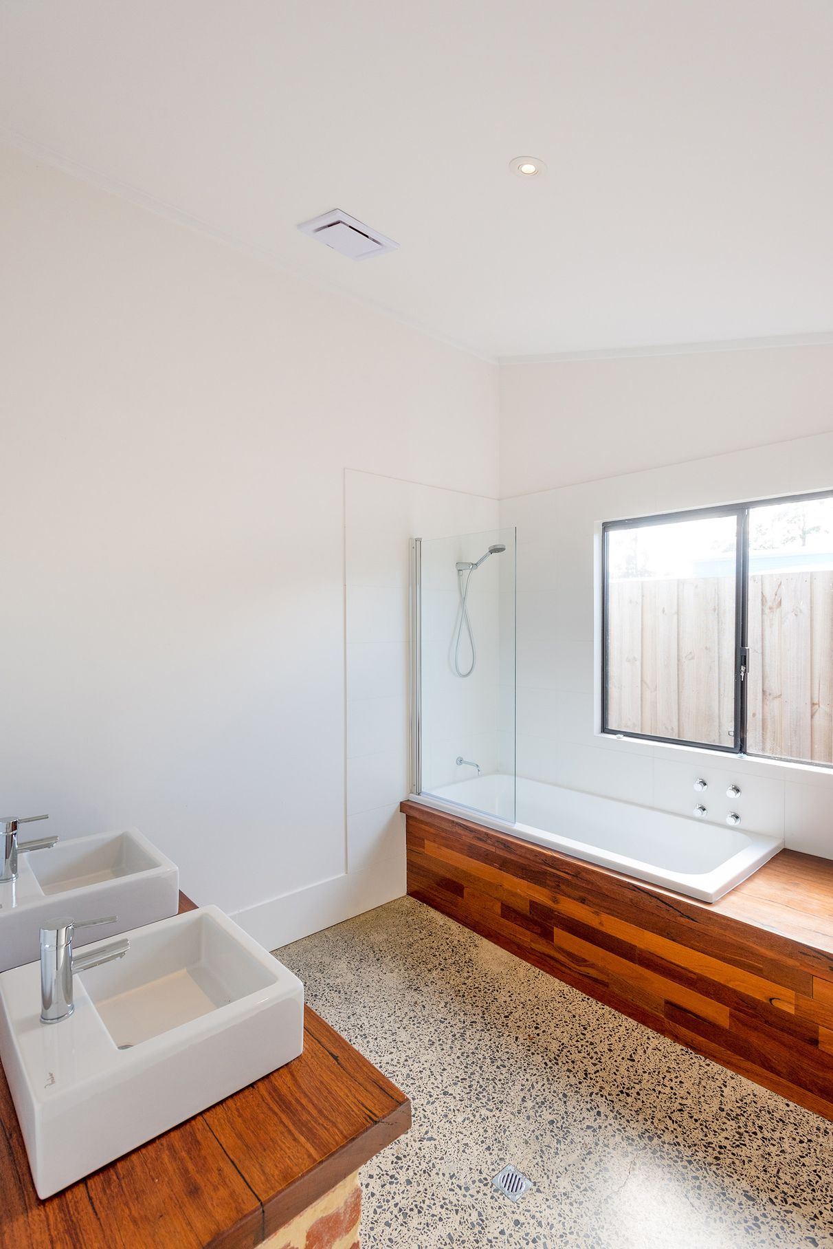 - Beautiful family bathroom with timber bathtub, brick & timber double vanity