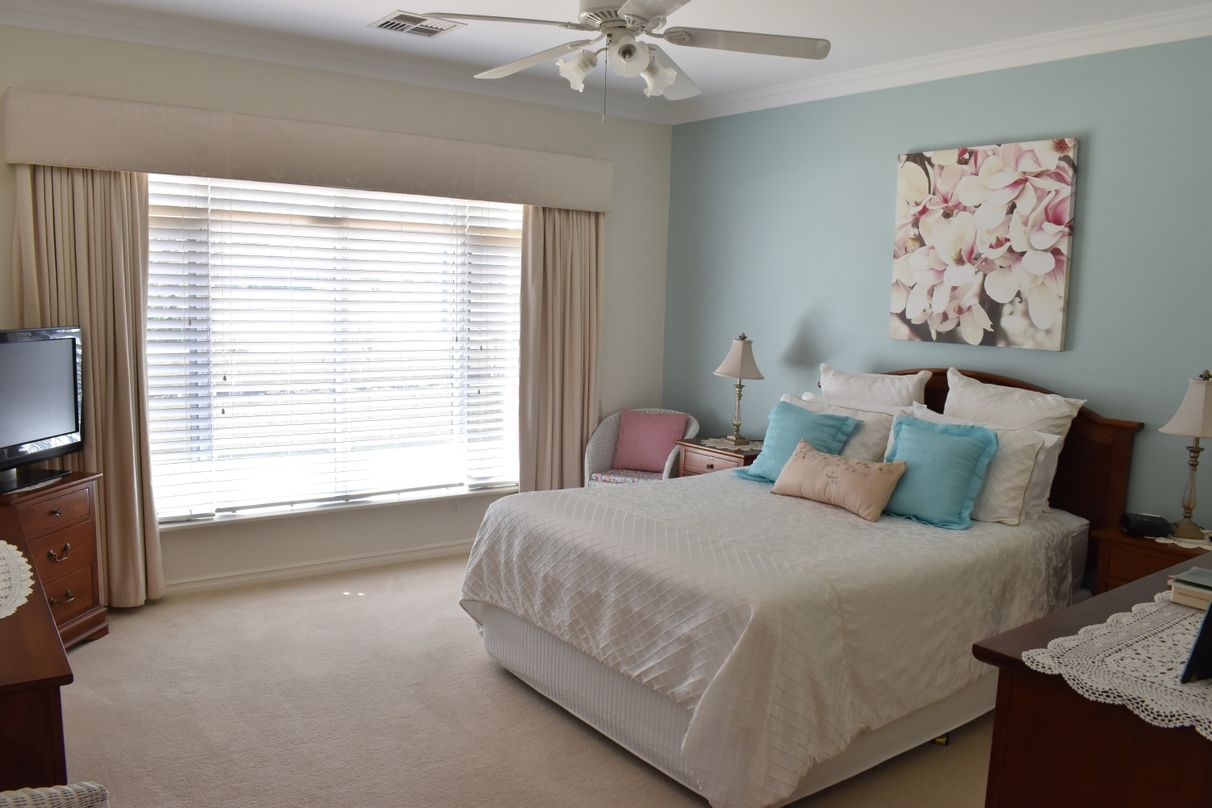 Large master bedroom with large walk-in robe and ceiling fan